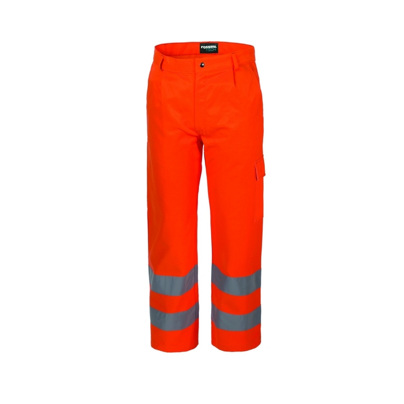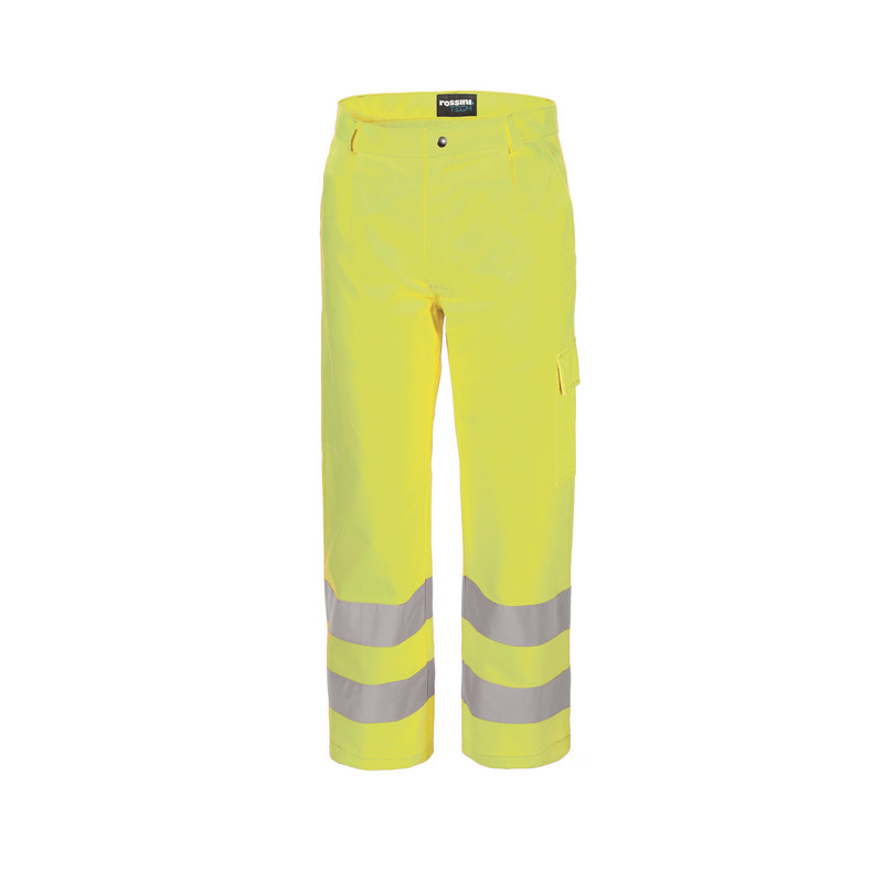 COTONE A CONTATTO CON LA PELLE Pantalone alta visibilità con chiusura alla patta con cerniera e bottone. Una tasca posteriore applicata a destra chiusa con bottone automatico, un tascone laterale chiuso con aletta e velcro e porta penne applicato su gamba sinistra, tasche anteriori a filetto con taglio obliquo, un porta metro. Doppia banda rifrangente.