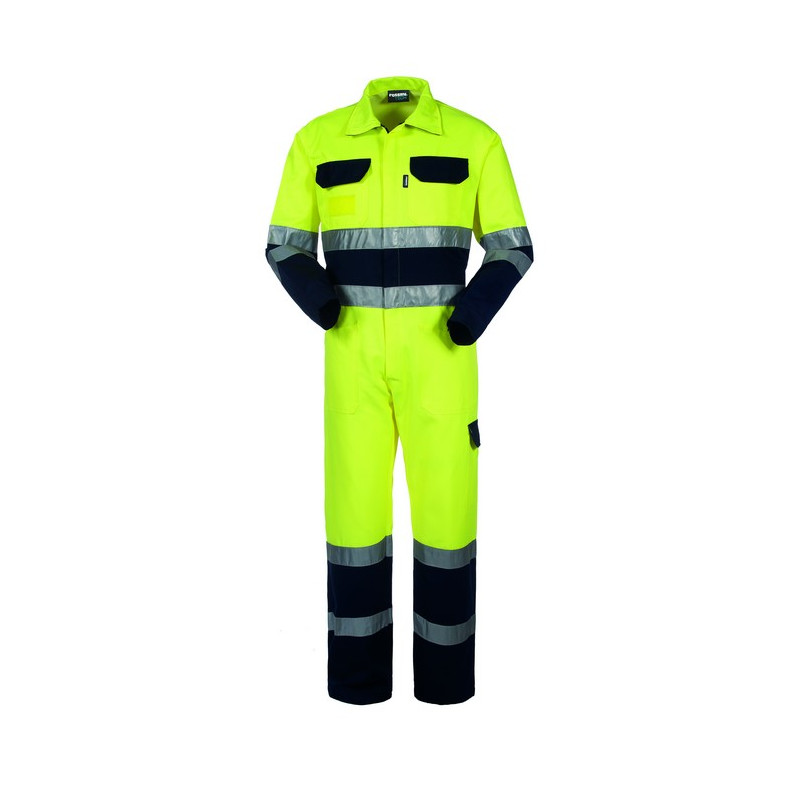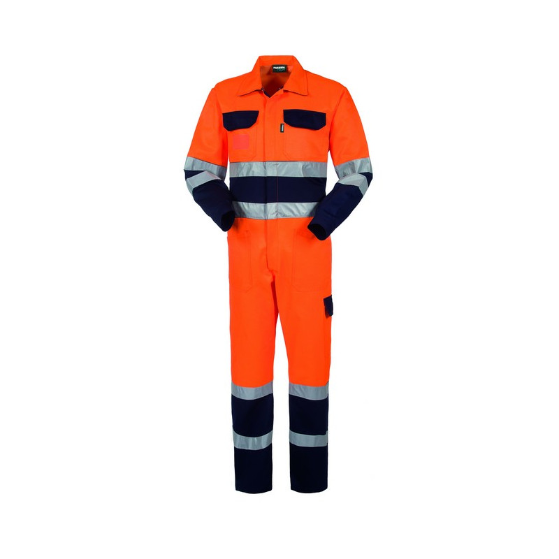 COTONE A CONTATTO CON LA PELLE Tuta alta visibilità con collo a camicia con alamaro di chiusura regolabile con velcro e chiusura centrale con zip a doppio cursore coperta da patella, elastico in vita posteriore. Due taschini applicati al petto chiusi con aletta di colore a contrasto e punto velcro, due tasche inferiori applicate, un tascone applicato su gamba sinistra chiuso con aletta di colore a contrasto e punto velcro, un porta metro. Doppia banda rifrangente al giro torace, al giro manica e al fondo gamba, polsi chiusi con velcro. *** ALTRI COLORI DISPONIBILI SU RICHIESTA (VEDERE SCHEDA TECNICA) ***