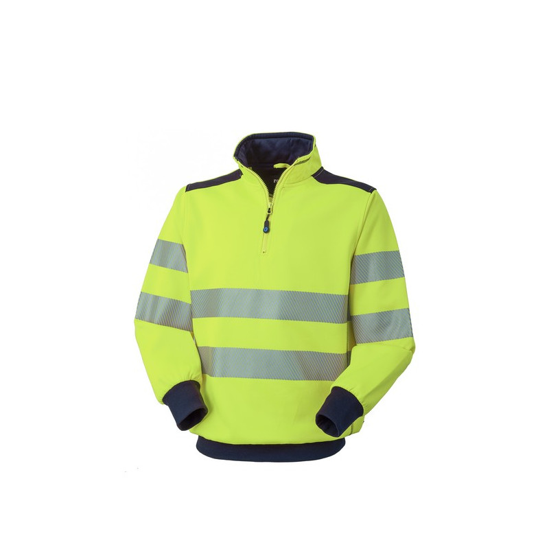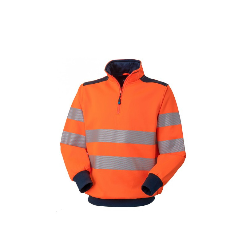 Felpa alta visibilità con collo alto chiuso con con mezza zip. Inserti sulle spalle, fascia parasudore e lunetta nella parte posteriore del collo di colore a contrasto, polsi e fascia girovita in maglia elastica di colore a contrasto. Doppie bande rifrangenti stampate a transfer con pattern diagonale alle maniche e al girovita.