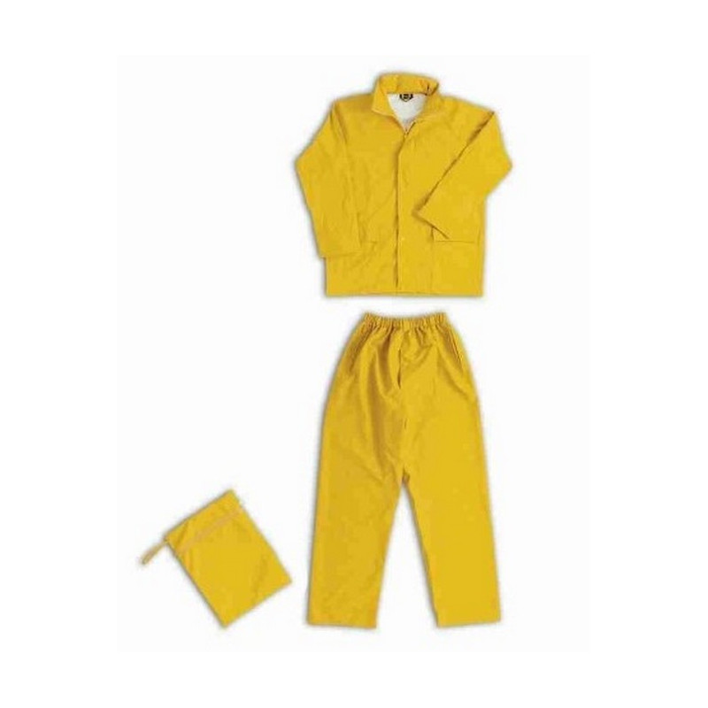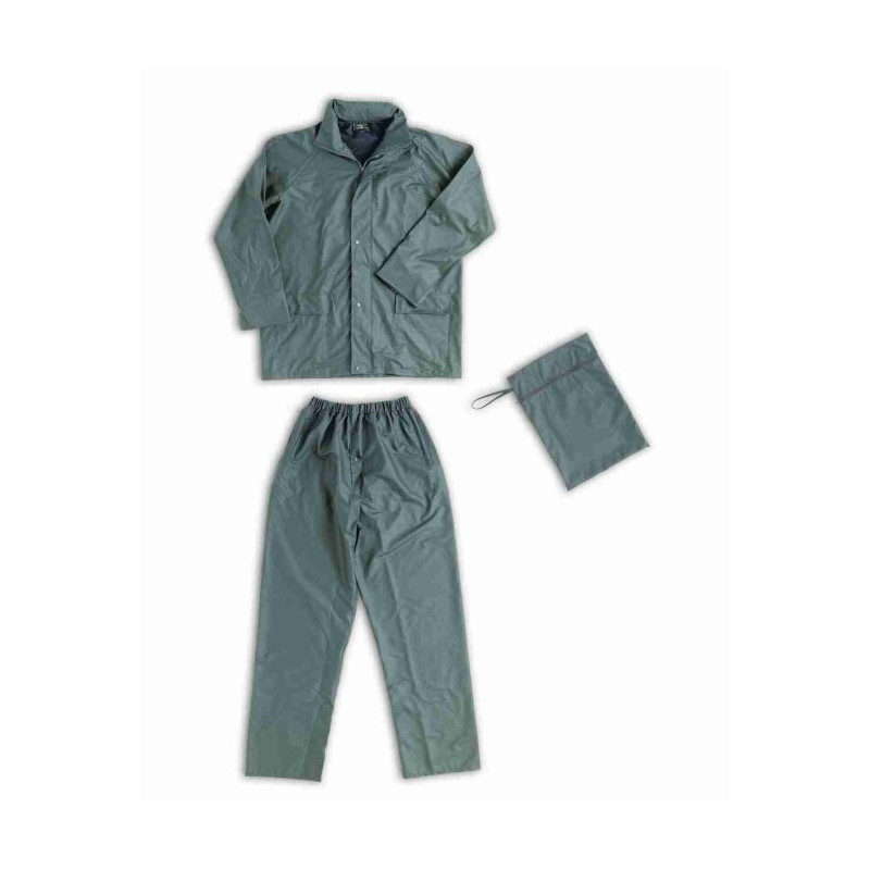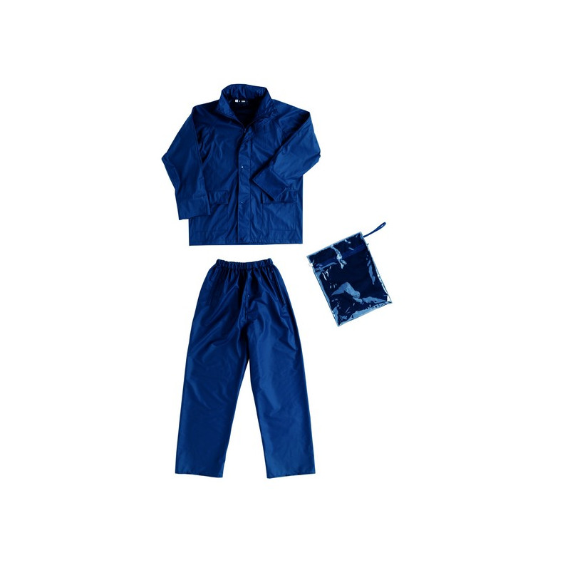 Completo giacca e pantalone con chiusura con cerniera centrale coperta da patella chiusa con bottoni automatici, cappuccio con coulisse di chiusura inserito nel collo chiuso con cerniera, profilo rifrangente applicato sulla schiena. Due tasche inferiori coperte da patella, fondo manica con elastico interno, fori di aerazione sotto le ascelle. PANTALONE: Elastico su tutto il girovita, chiusura alla patta con bottoni automatici, due tasche laterali passamano chiuse con cerniera, fondo della gamba regolabile con bottone automatico. Inseriti in busta con cerniera.