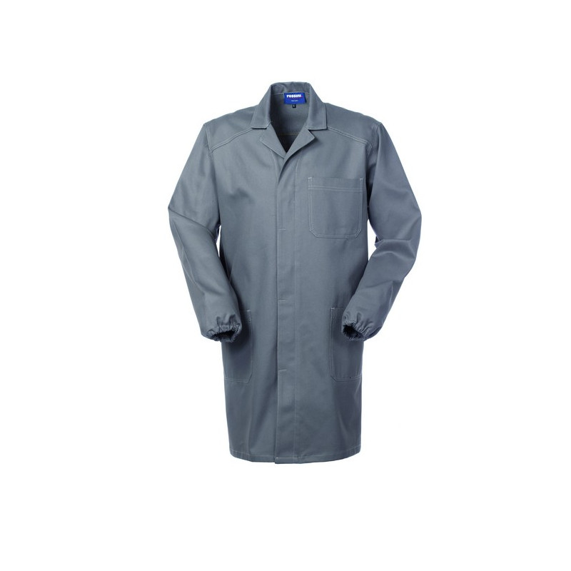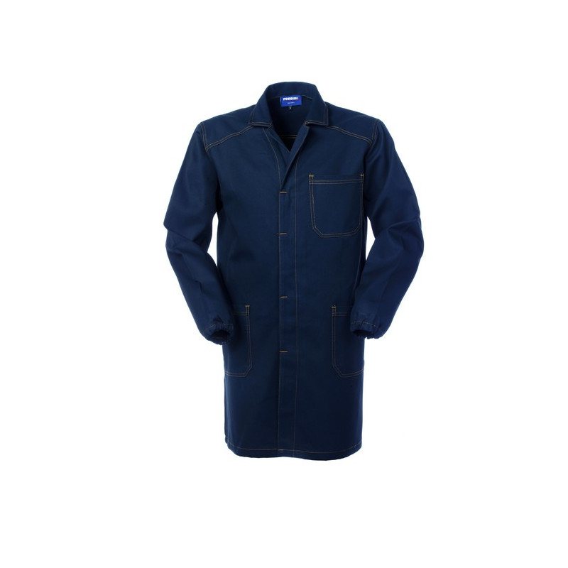 Camice da lavoro con chiusura anteriore con bottoni coperti, collo a rever. Taschino al petto e due tasche inferiori, polsi con elastico, cuciture di colore a contrasto.