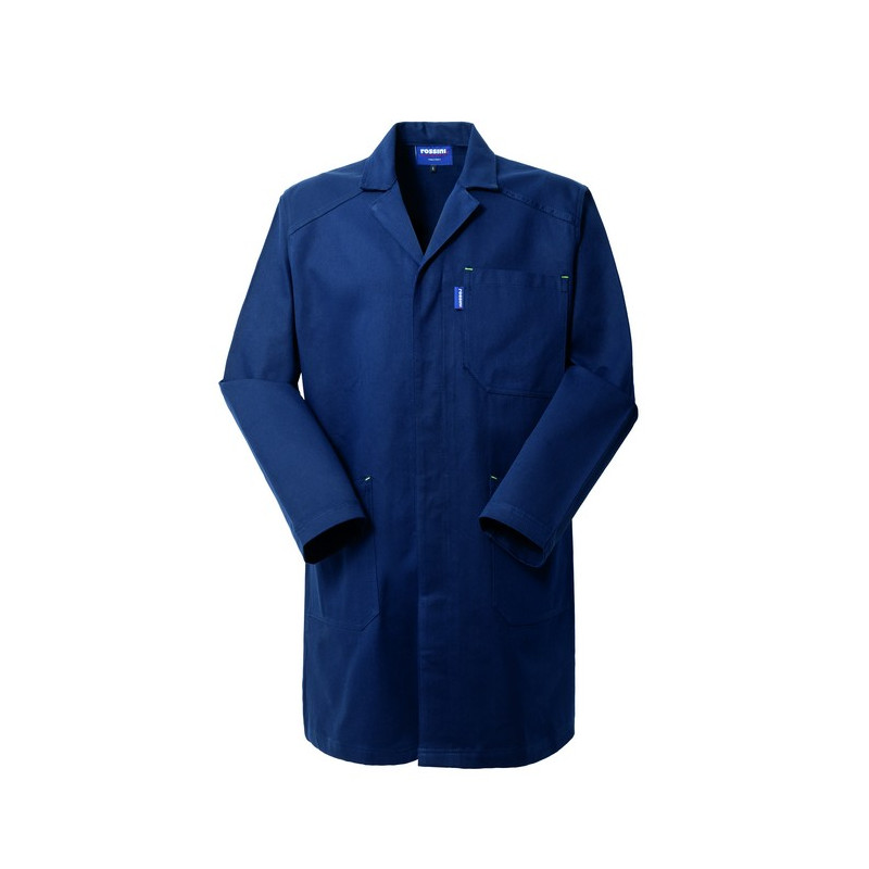 Camice da lavoro con chiusura centrale con bottoni coperti, schiena intera, un taschino applicato al petto sinistro e due tasche inferiori applicate, travette di colore a contrasto.