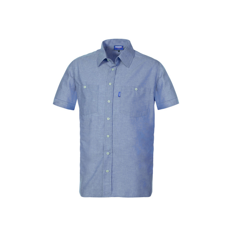 Camicia con chiusura centrale con bottoni scoperti, maniche corte. Due taschini applicati al petto chiusi con bottone. Travette di rinforzo.