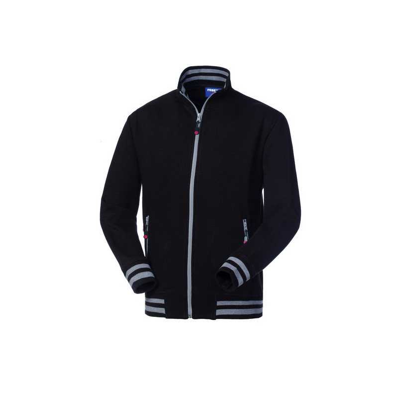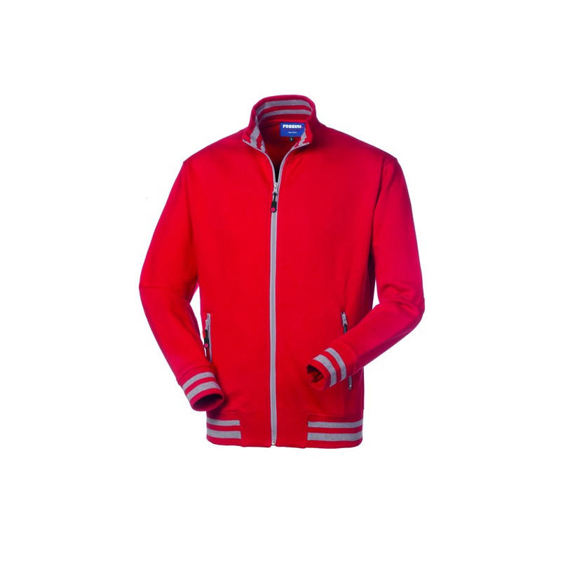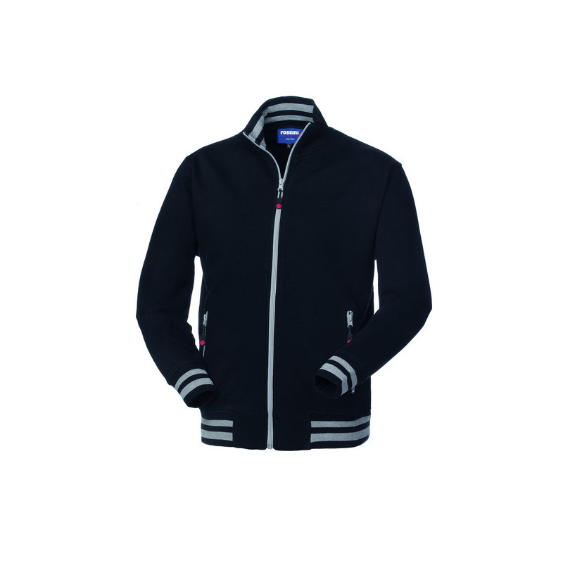Felpa con chiusura centrale con cerniera in plastica, collo in maglia elastica di colore in tinta con inserti di colore a contrasto interno, parasudore interno al collo. Polsi e fascia girovita in maglia elastica con inserti di colore a contrasto, due tasche inferiori a filetto chiuse con cerniera in plastica.