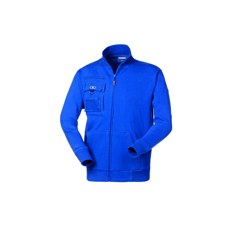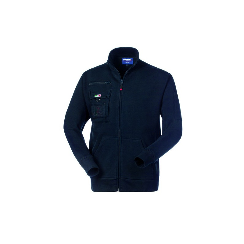 Felpa con chiusura centrale con cerniera in plastica, parasudore interno al collo. Un taschino chiuso con aletta e punti velcro applicato al petto destro, un taschino a filetto chiuso con cerniera al petto destro, porta badge in PVC removibile applicato con velcro, portapenne a doppio scomparto applicato alla manica sinistra, due tasconi anteriori. Polsi, collo e parte della fascia girovita in maglia elastica.