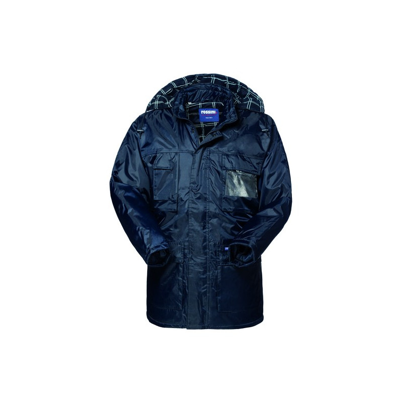 Visualizza ingrandito Parka imbottito con chiusura con cerniera coperta da patta chiusa con bottoni automatici nascosti, cappuccio staccabile imbottito con fodera di flanella di colore blu a quadretti bianchi e cordino regolabile. Un taschino a soffietto applicato sul petto destro chiuso con velcro, un taschino lato destro chiuso con cerniera verticale, un taschino a soffietto anteriore applicato chiuso con aletta e bottoni automatici nascosti, un taschino interno applicato,due tasche a soffietto chiuse con aletta e bottoni automatici nascosti, un portabadge in PVC removibile. Fondo manica con polso interno in maglina, fori di aerazione sotto le ascelle, elastico in vita.