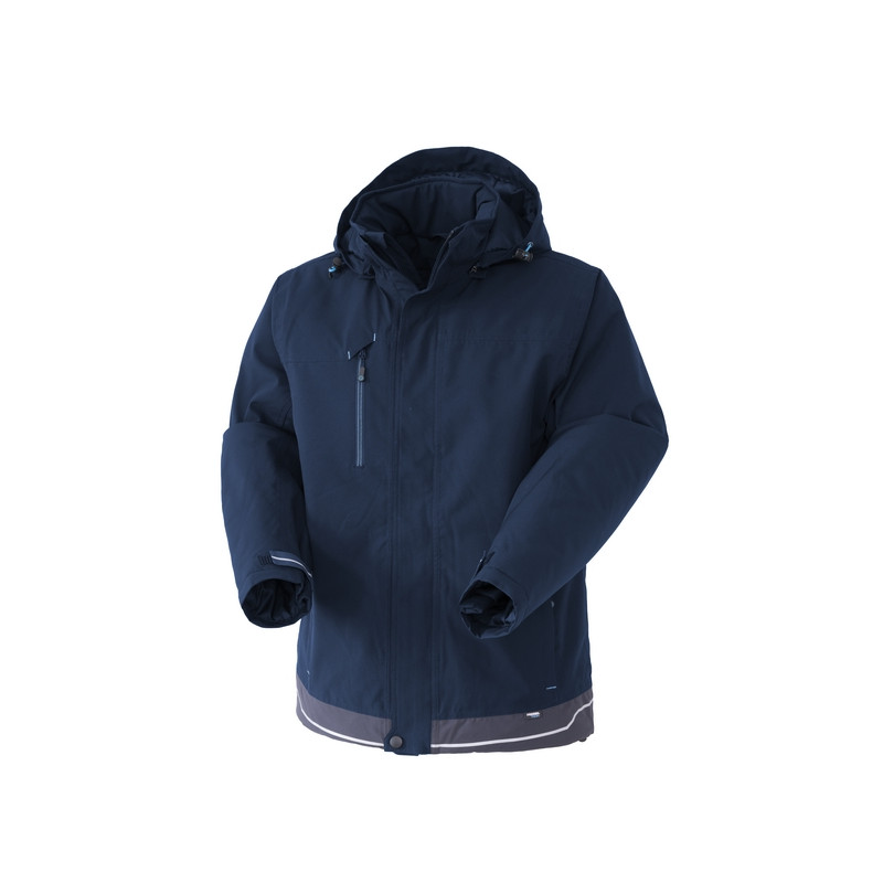 Giubbotto invernale imbottito: BLOCCA LA PIOGGIA, SFIDA IL FREDDO. Composto al 52% da materiali riciclati, fodera traspirante termica con punti d'argento che trattiene il calore corporeo. Chiusura anteriore con zip coperta da patella chiusa con velcro. Cappuccio con coulisse, removibile con zip. Un taschino a filetto al petto destro, due tasche inferiori a filetto chiuse con zip, profili rifrangenti anteriori e posteriori. Zip orizzontale interna al fondo per la possibilità di personalizzazione sulla schiena. 6000 mm WP / 3000 MVP
