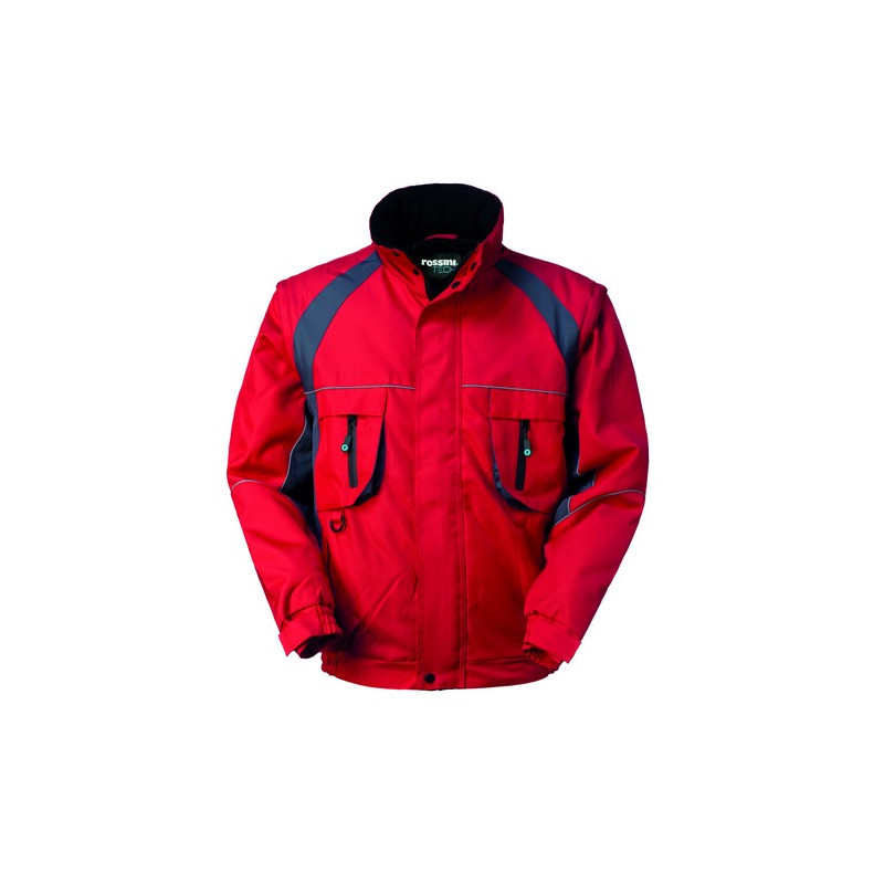 Giubbotto imbottito con cerniera coperta da patella chiusa con velcro e bottoni automatici, cappuccio con coulisse inserito nel collo in pile chiuso con velcro, maniche staccabili. Taschini con soffietto laterale applicati al petto chiusi con cerniera verticale e aletta, taschino interno al petto sinistro chiuso con velcro, tasche inferiori a filetto chiuse con patella antivento. Polsi al fondo manica con elastico regolabili con velcro, elastico e inserti di colore a contrasto lungo i fianchi, spalle anteriori e posteriori, maniche con profilo rifrangente grigio.