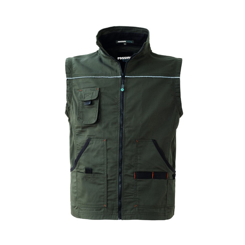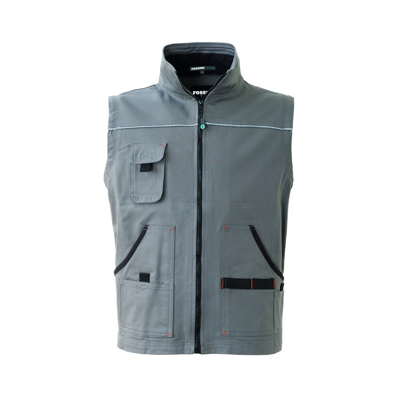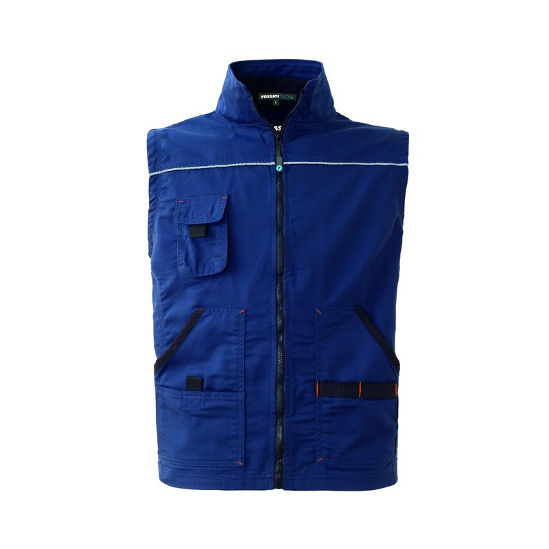 Gilet da lavoro con collo alla coreana e chiusura anteriore con cerniera. Un taschino applicato al petto destro chiuso con aletta e velcro, due tasconi inferiori con taschini applicati chiusi con punto velcro. Carré anteriore e posteriore profilati con coda di topo rifrangente, inserto in nylon.