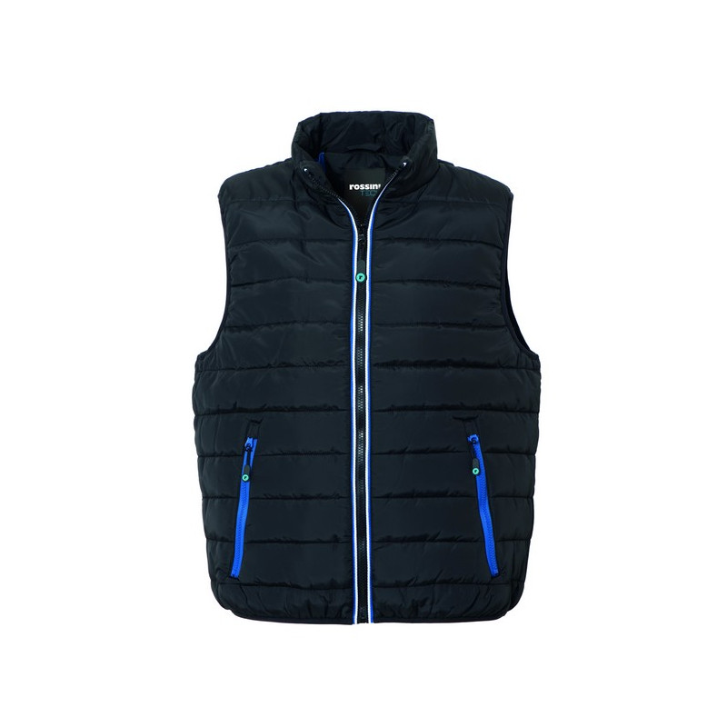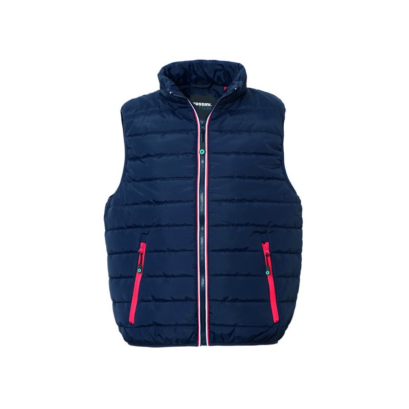 Gilet imbottito con chiusura anteriore con cerniera, giromanica e fondo profilati con sbieco elasticizzato, due tasche inferiori a filetto chiuse con cerniera.