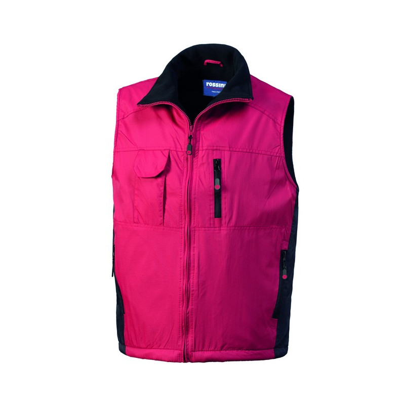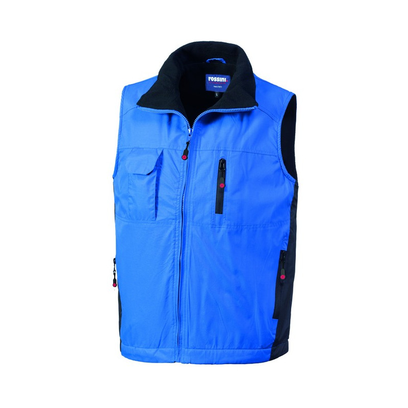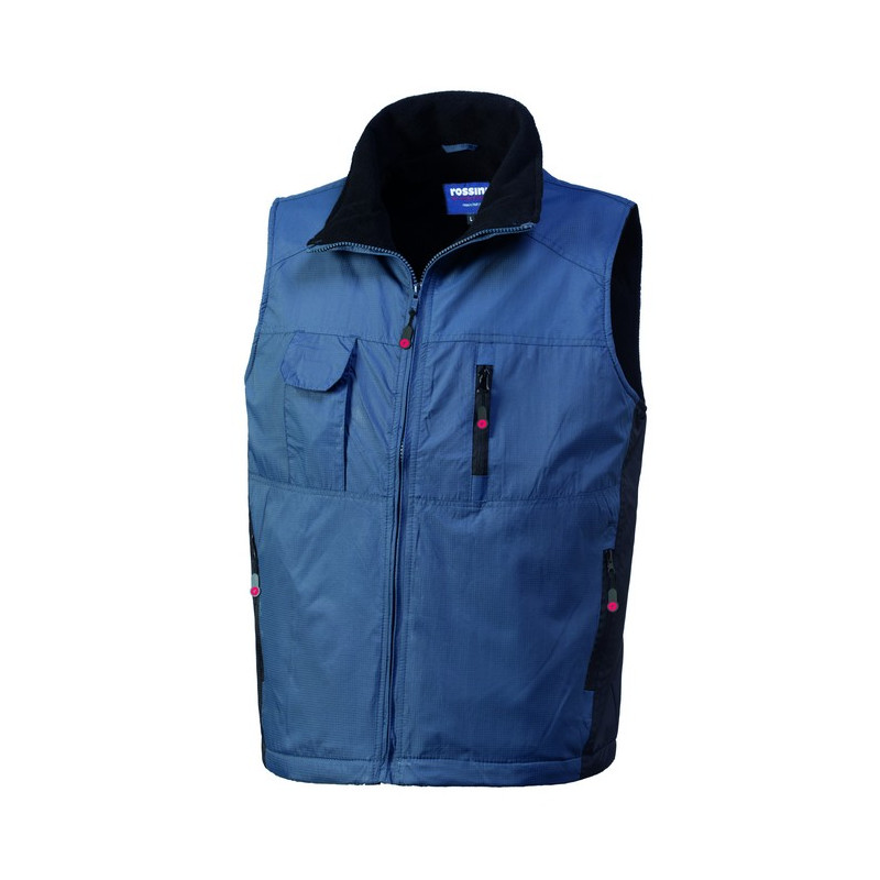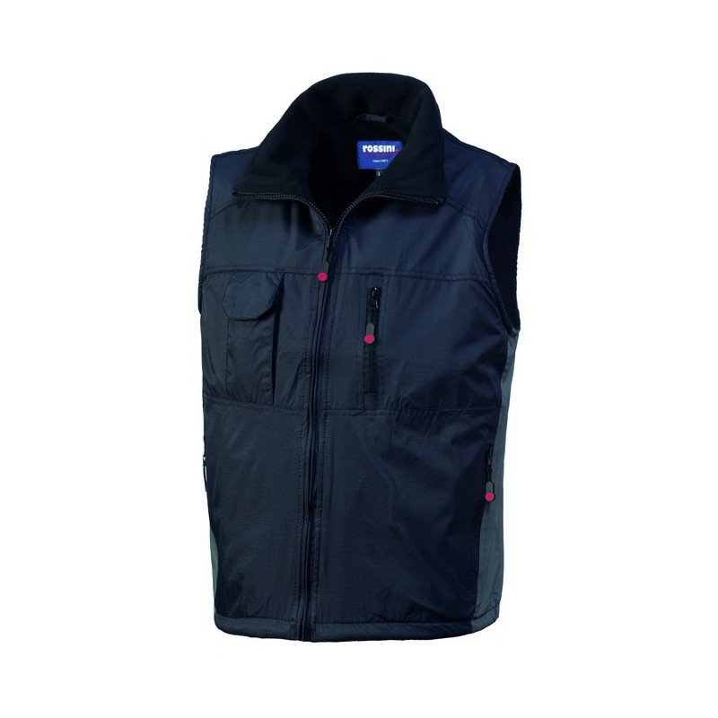 Gilet con chiusura anteriore con zip centrale. Un taschino con soffietto laterale applicato al petto destro chiuso con aletta e velcro, un taschino interno applicato a sinistra chiuso con velcro, un taschino a filetto al petto sinistro chiuso con zip verticale, due tasche inferiori a filetto chiuse con zip. Coulisse al fondo e inserti di colore a contrasto lungo i fianchi.