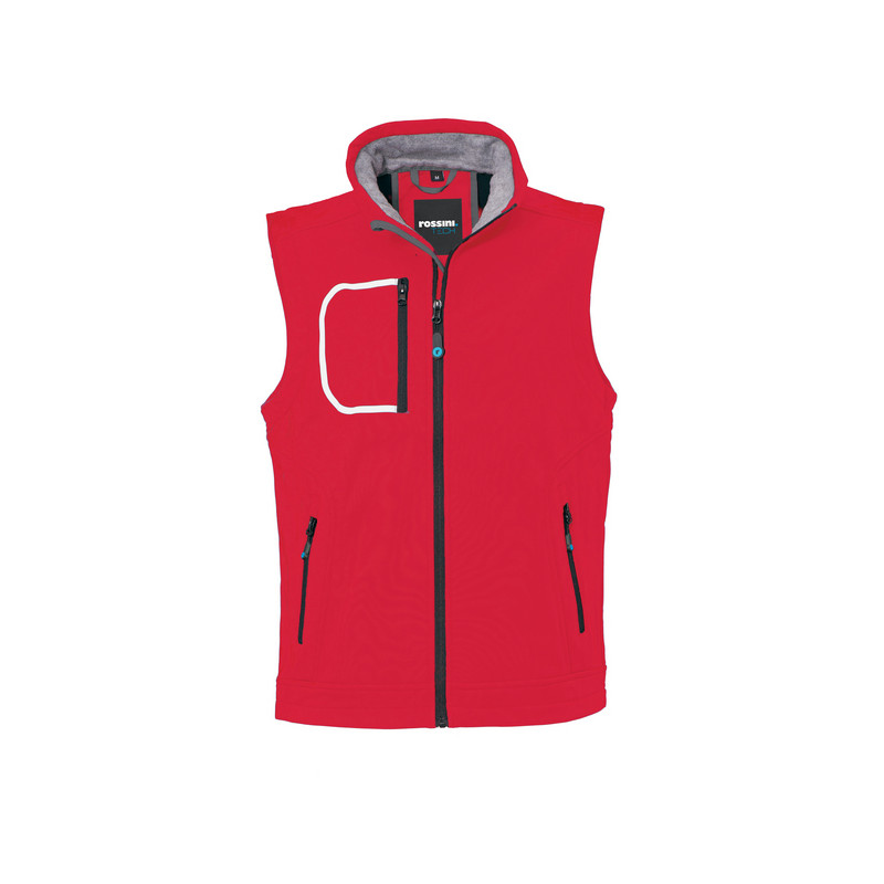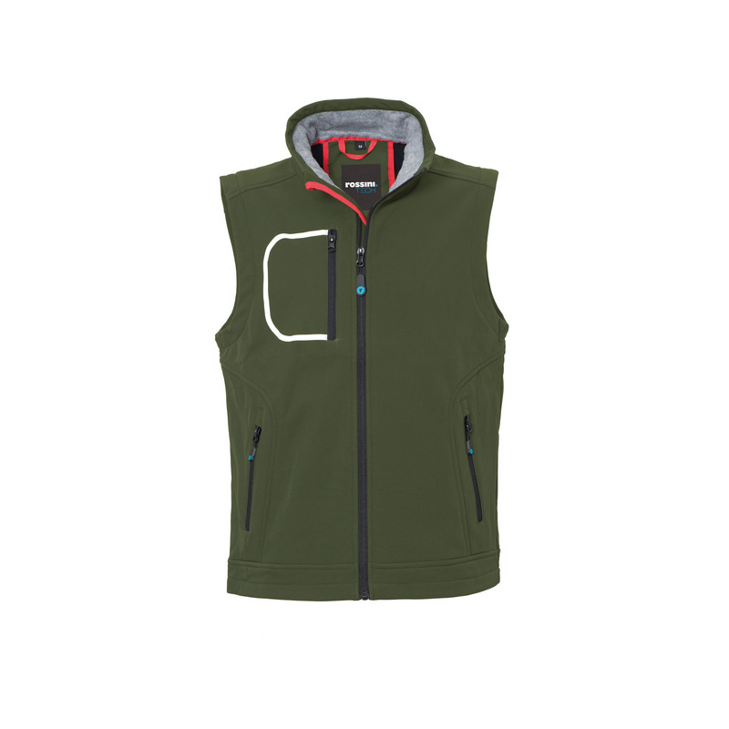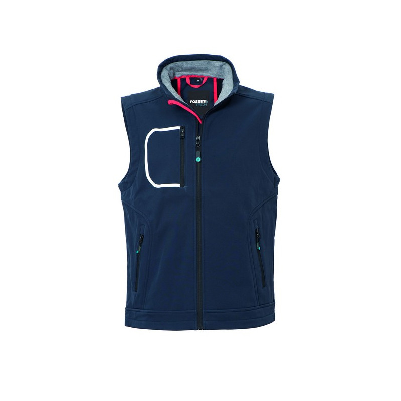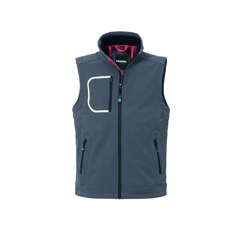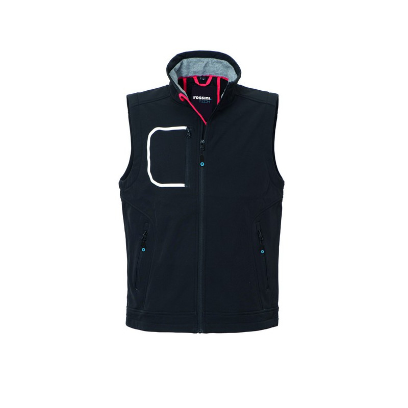 Gilet realizzato in tessuto Softshell a tre strati, chiusura con zip centrale, foro di aerazione sulla schiena. Un taschino a filetto al petto destro chiuso con zip verticale e profilo rifrangente, due tasche inferiori a filetto chiuse con zip. 8000 mm WP