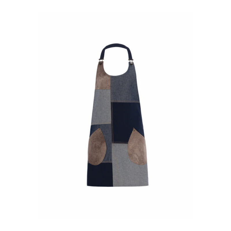 Visualizza ingrandito 19P01H073 Stile sorprendente per questi grembiuli in denim patchwork blue, sia nella versione uomo che in quella donna. Il tessuto denim usato al rovescio, abbinato a inserti e tasche in alcantara, gli conferiscono un aspetto autentico e contemporaneo. Le cuciture a contrasto e la metalleria in ottone invecchiato illuminano e rendono il capo davvero ricercato. Tipica l’allacciatura salopette con tracolla regolabile.