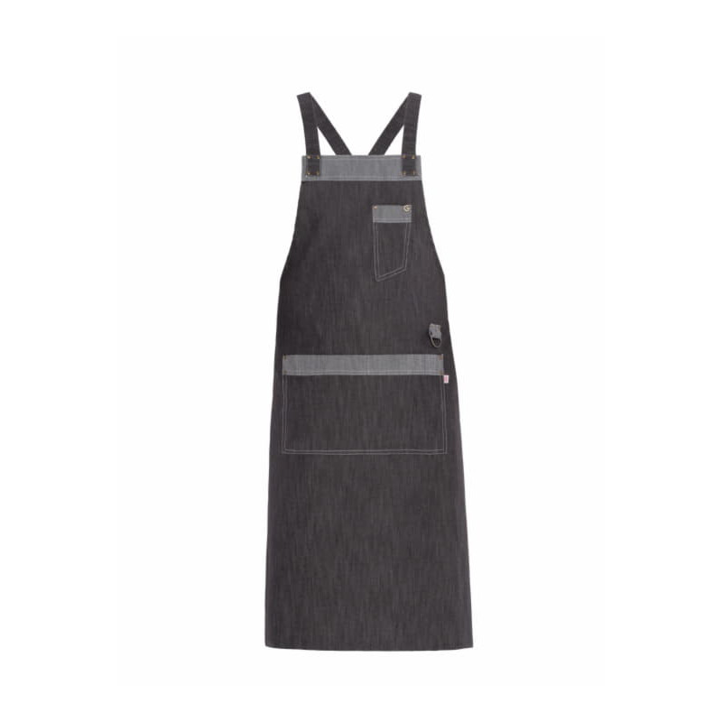 Visualizza ingrandito 19P01H071 Grembiule pettorina unisex realizzato con impunture a due aghi in contrasto e giochi di tessuto, usando sia il dritto e che il rovescio del tessuto. La tracolla è fissata al capo con borchie in ottone anticato, l’allacciatura è regolabile sul retro con lacci ad incrocio. Un taschino porta penne con rivetto personalizzato “G”, un’ampia tasca centrale con impuntura a due aghi e un porta torcione ad anello completano il capo.