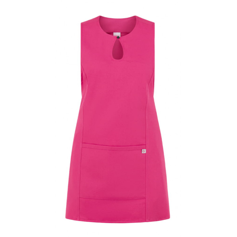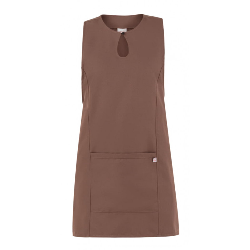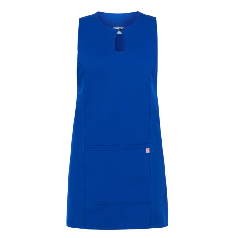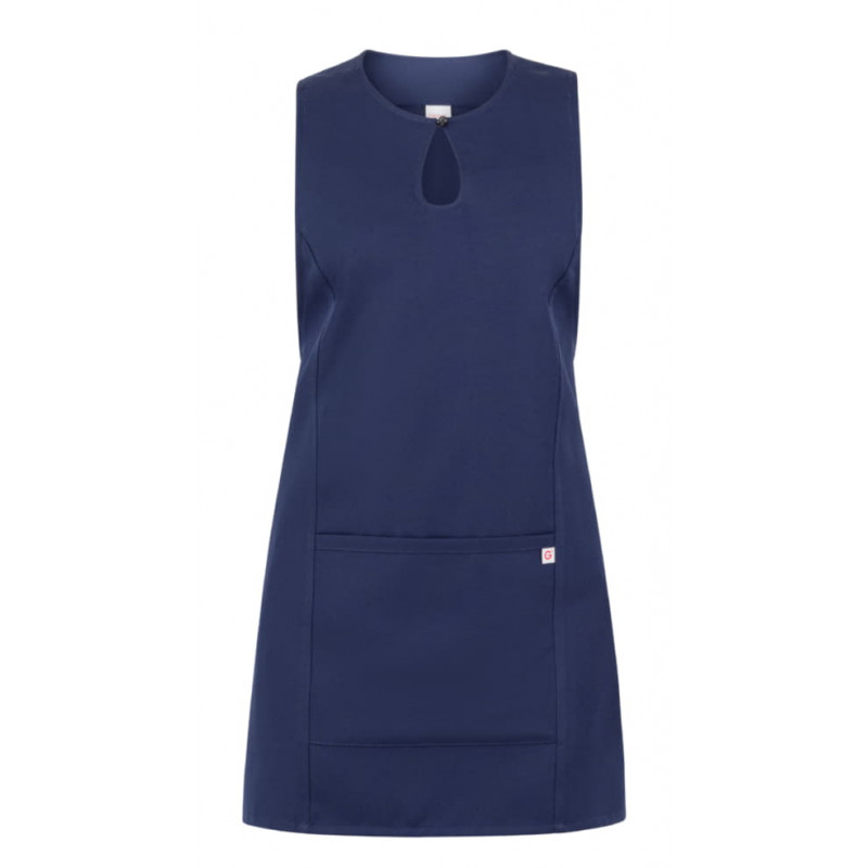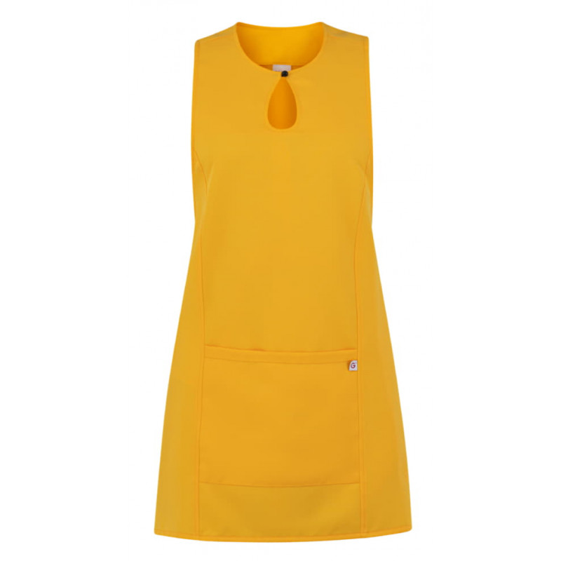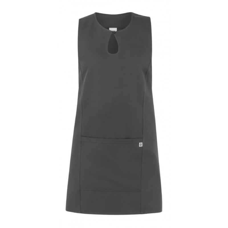 Lo scamiciato Gioia, è coperto nel dietro, ha un elegante scollo a goccia, presenta due tagli sui fianchi, impunturati a piedino, un’ampia tasca centrale, e quattro lacci, posti due sul davanti e due sul dietro che lo fanno aderire in vita. É realizzato in 100% poliestere di media grammatura, resistente alle alte temperature e al candeggio, ed è disponibile in ben quattordici varianti colore.