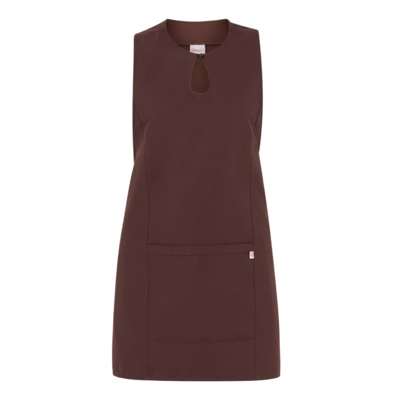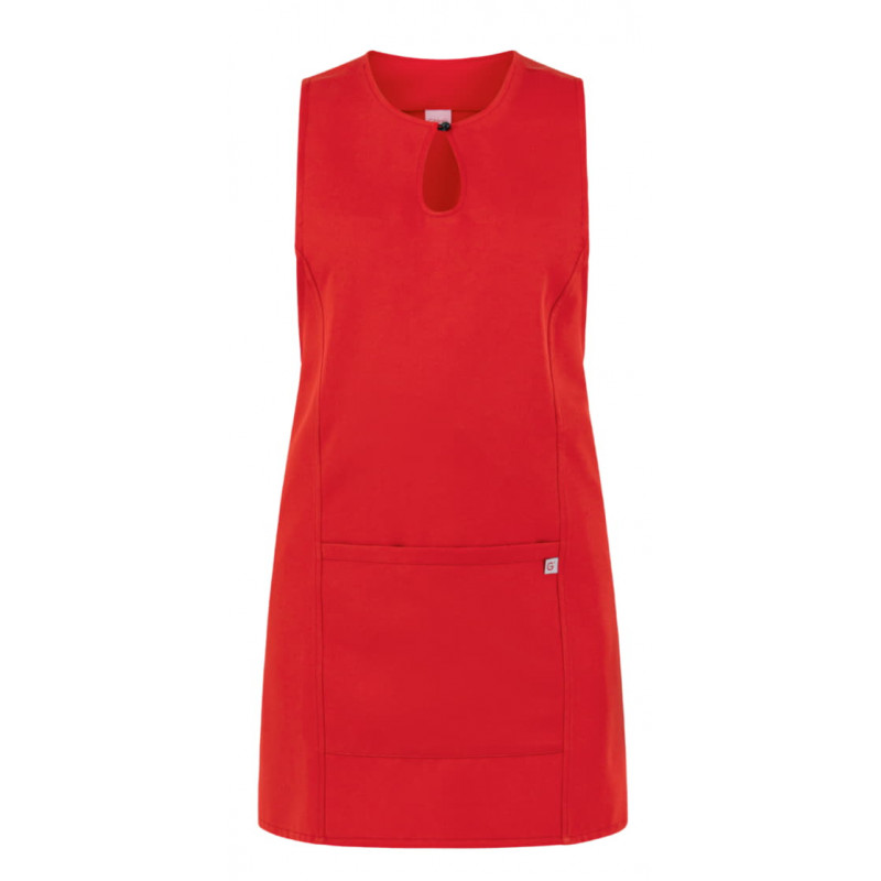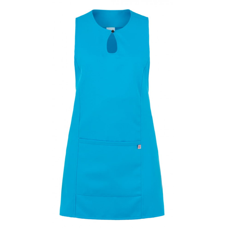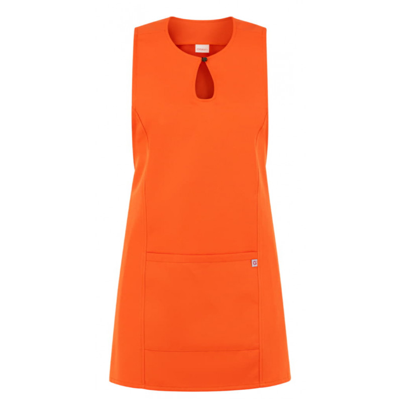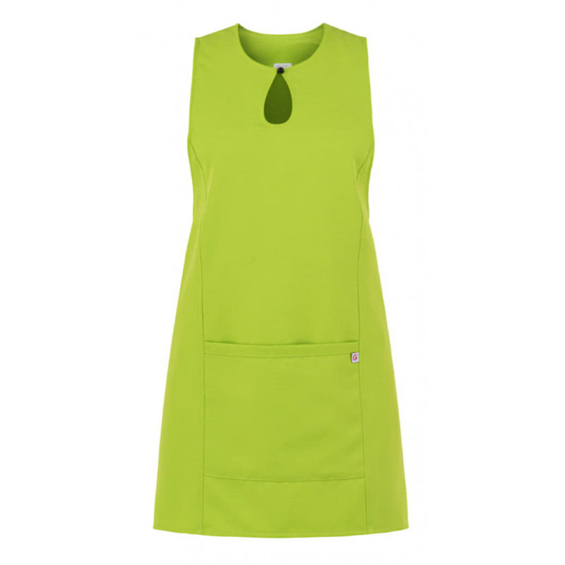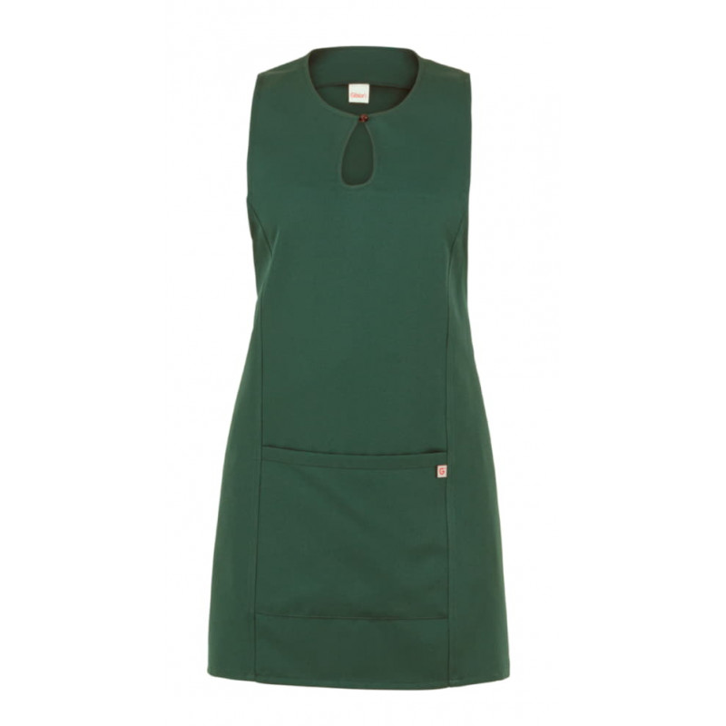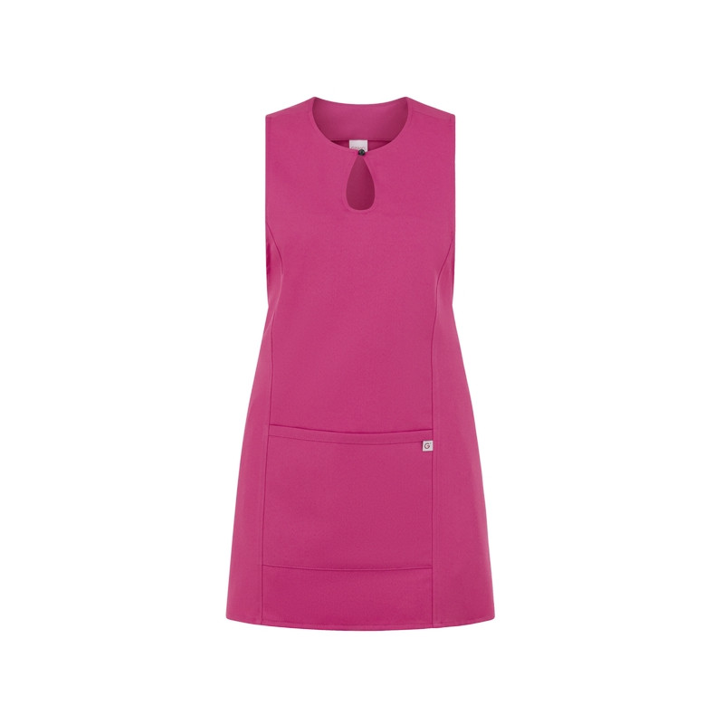 Lo scamiciato Gioia, è coperto nel dietro, ha un elegante scollo a goccia, presenta due tagli sui fianchi, impunturati a piedino, un’ampia tasca centrale, e quattro lacci, posti due sul davanti e due sul dietro che lo fanno aderire in vita. É realizzato in 100% poliestere di media grammatura, resistente alle alte temperature e al candeggio, ed è disponibile in ben quattordici varianti colore.