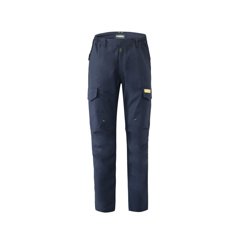 Pantalone da lavoro con chiusura alla patta con zip e bottone automatico nascosto, passanti in vita ed elastico ai fianchi. Due tasche anteriori, due tasconi laterali chiusi con aletta e velcro, due tasche posteriori applicate con aletta e velcro. Pences alle ginocchia per maggior comfort. Etichetta jacquard con pittogrammi, travette varie di colore giallo.