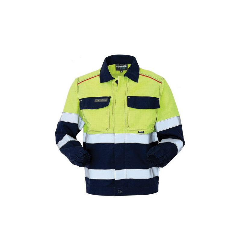 Visualizza ingrandito Giubbetto da lavoro con chiusura anteriore con bottoni tradizionali coperti, collo a camicia. Due taschini applicati al petto chiusi con aletta e velcro, elastico al fondo manica, spalloni profilati con coda di topo rossa. Travette varie di colore giallo, etichetta jacquard con pittogrammi cucita su taschino petto destro, due strisce rifrangenti.