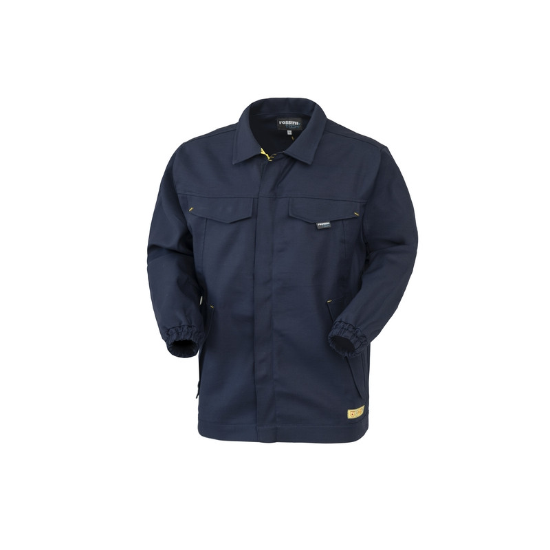 Giubbetto da lavoro con chiusura anteriore con zip coperta da patella chiusa con punti velcro. Collo a camicia, due taschini al petto chiusi con aletta e velcro, due tasche inferiori con apertura obliqua chiuse con aletta e velcro. Carré anteriore e posteriore, polsi con elastico e pences sui gomiti per maggior comfort. Etichetta jacquard con pittogrammi, travette varie di colore giallo.