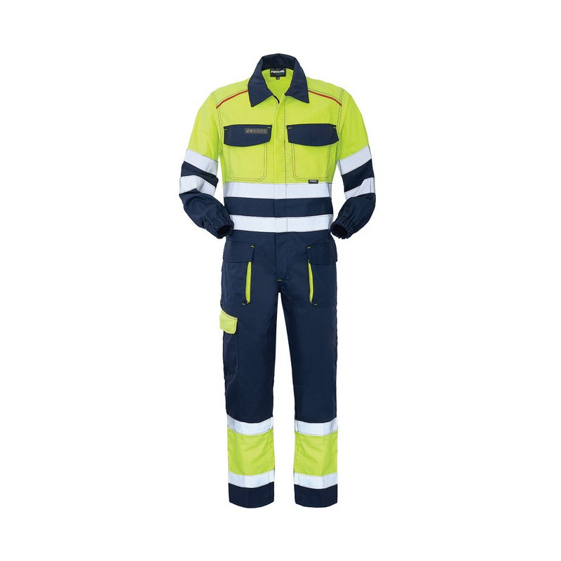 Visualizza ingrandito Tuta da lavoro con chiusura centrale con zip a doppio cursore coperta da patella, spalloni profilati con coda di topo rossa, elastico in vita posteriore. Due tasche anteriori inferiori applicate chiuse con aletta e velcro e soffietto laterale interno, due taschini applicati al petto chiusi con aletta e velcro, tascone applicato lateralmente su gamba destra chiuso con aletta e velcro, elastico al fondo manica, due strisce rifrangenti. Travette varie di colore giallo, etichetta jacquard con pittogrammi cucita su aletta taschino petto destro.