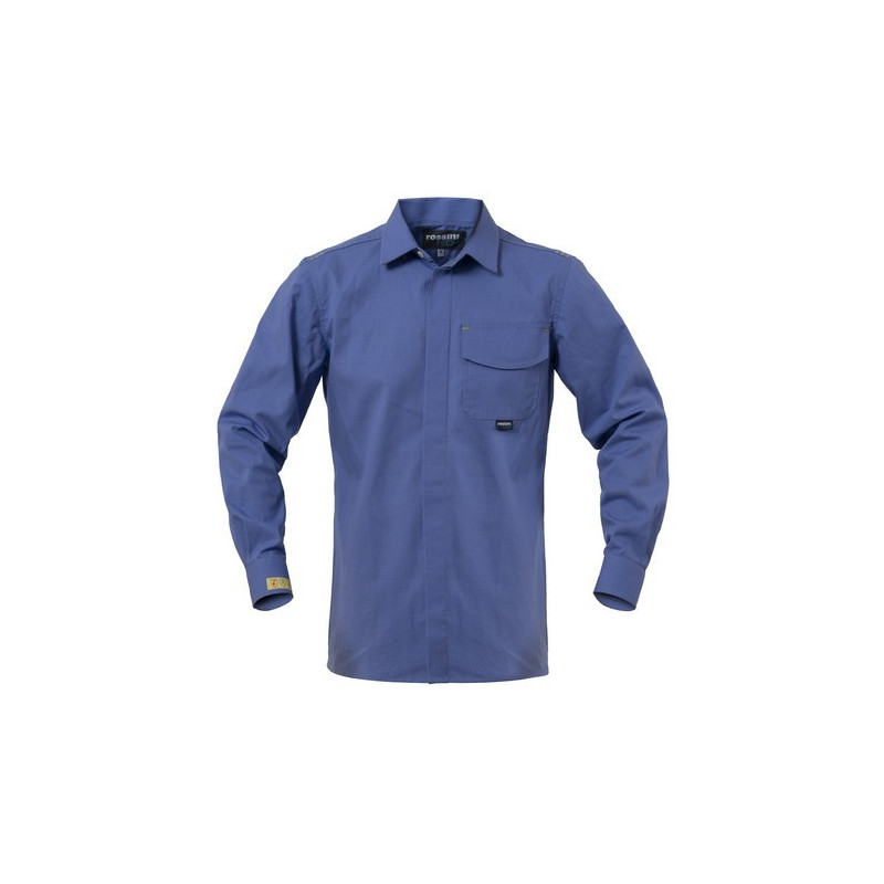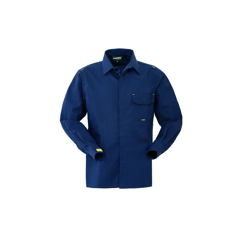 Camicia da lavoro con chiusura anteriore con bottoni tradizionali coperti. Taschino applicato al petto sinistro chiuso con aletta e velcro, carré posteriore. Etichetta jacquard con pittogrammi cucita sul polso manica destra, manica lunga con polsi chiusi con bottoni, travette varie di colore giallo.