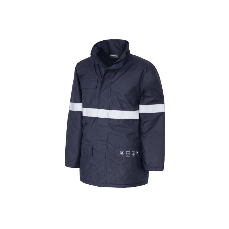 Parka imbottito con chiusura centrale con zip coperta da coprizip chiuso con punti velcro, collo alto, cappuccio regolabile da coulisse richiudibile nel collo con chiusura in velcro. Un taschino applicato al petto destro chiuso con velcro. Etichetta interna con registro numero lavaggi e dati personali, un taschino a filetto chiuso con punto velcro nella parte interna del petto sinistro, polso regolabile con velcro. Due tasconi inferiori coperti da aletta, polso interno elasticizzato per maggiore comfort e protezione. Strisce rifrangenti anteriori e posteriori.