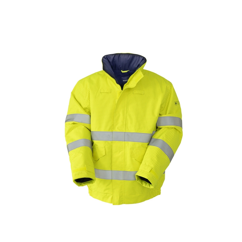 Giubbotto imbottito con chiusura centrale con zip coperta da coprizip chiuso con punti velcro, collo alto, cappuccio regolabile da coulisse richiudibile nel collo con chiusura in velcro. Gancio porta radio al petto. Etichetta interna con registro numero lavaggi e dati personali, un taschino a filetto chiuso con punto velcro nella parte interna del petto sinistro, polso regolabile con velcro. Due tasconi inferiori coperti da aletta, polso interno elasticizzato per maggiore comfort e protezione. Inserti di tessuto di colore a contrasto, strisce rifrangenti anteriori e posteriori.