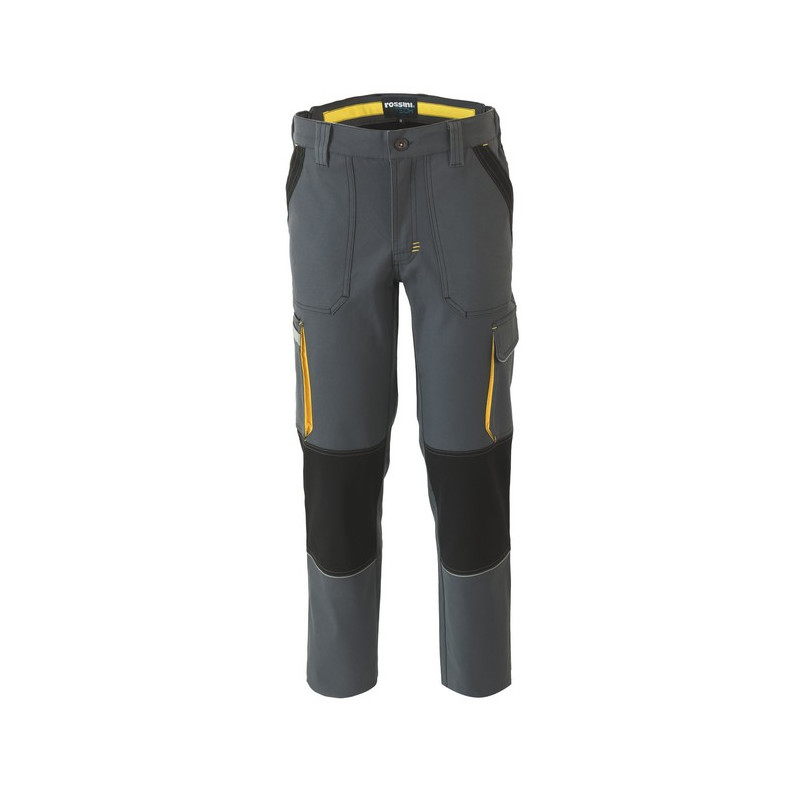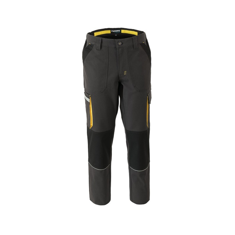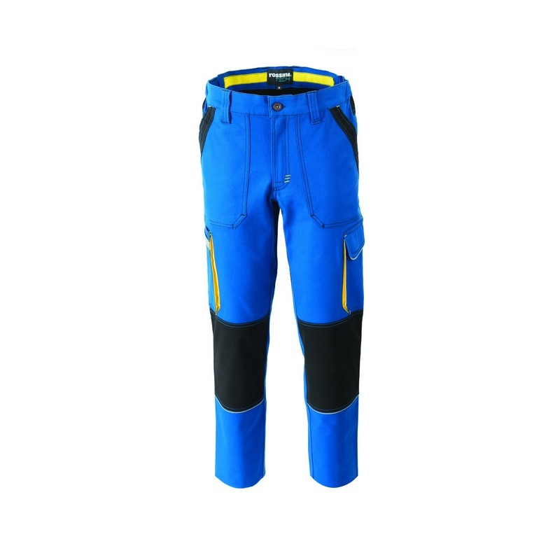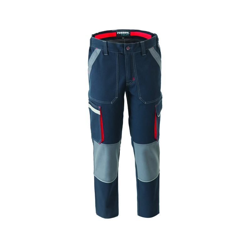 Pantalone da lavoro multistagione in canvas stretch, elastici laterali in vita e passanti. Due ampie tasche anteriori applicate con rinforzo esterno a contrasto, tasca laterale multifunzione a soffietto con striscia rifrangente, una tasca laterale a soffietto chiusa con aletta e velcro, tasche posteriori chiuse con aletta e velcro. Rinforzi di tessuto a contrasto sulle ginocchia, inserti e travette a contrasto. *** TAGLIA 4XL DISPONIBILE SOLO PER I COLORI 01 BLU E 12 GRIGIO ***