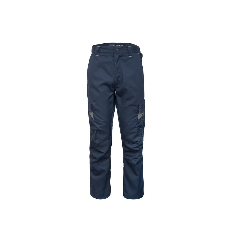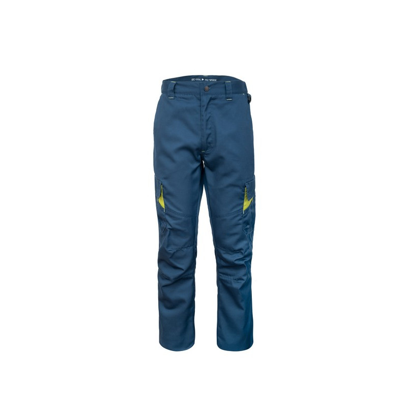 Pantalone da lavoro con elastico ai fianchi, chiusura alla patta con cerniera in plastica e bottone in metallo con finitura effetto rame, passanti in vita, fettuccia in cotone di colore a contrasto inserita all’interno della vita. Pratico anello di plastica inserito sul fianco sinistro per appendere accessori e strumenti. Due tasche anteriori con taglio classico e fodera con logo, un taschino a filetto inserito all’interno della tasca destra, capienti tasconi laterali multifunzione con inserto di colore a contrasto e chiusi con aletta e velcro, due tasche posteriori a filetto. Cuciture di rinforzo di colore a contrasto, pences alle ginocchia per maggior comfort.