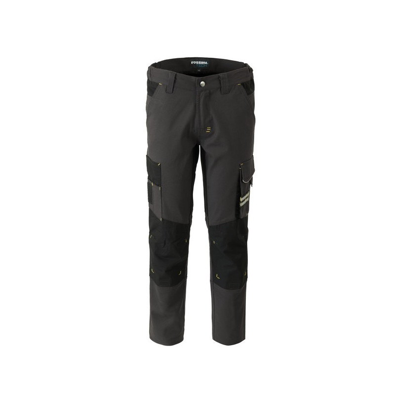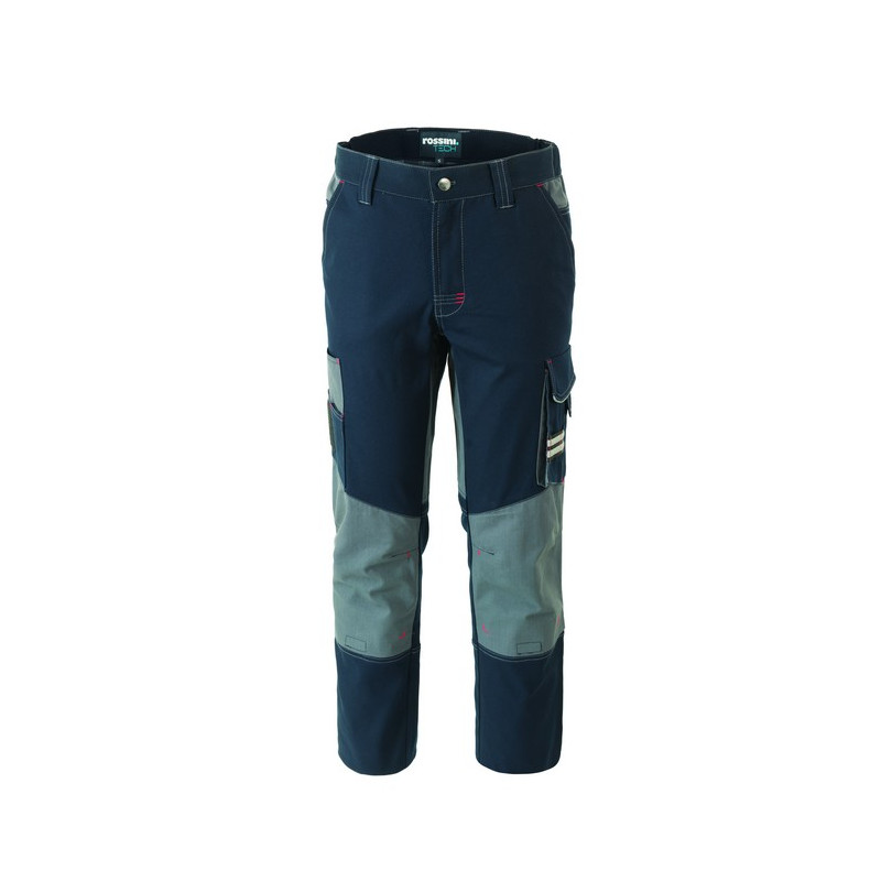 Pantalone da lavoro multistagione in canvas stretch, con porta ginocchiere in tessuto Ripstop, elastici laterali in vita e passanti, chiusura con cerniera in plastica e bottone. Doppie tasche anteriori, due tasche laterali di cui una tripla con inserto Ripstop con velcro portabadge, portapenne e inserto porta attrezzi, una doppia tasca a soffietto con chiusura velcro e porta attrezzi, due tasche posteriori chiuse con aletta e velcro. Rinforzi in tessuto Ripstop con triple cuciture al cavallo, alle ginocchia e posteriori, inserti e travette a contrasto. CONFEZIONATO IN SCATOLA SINGOLA