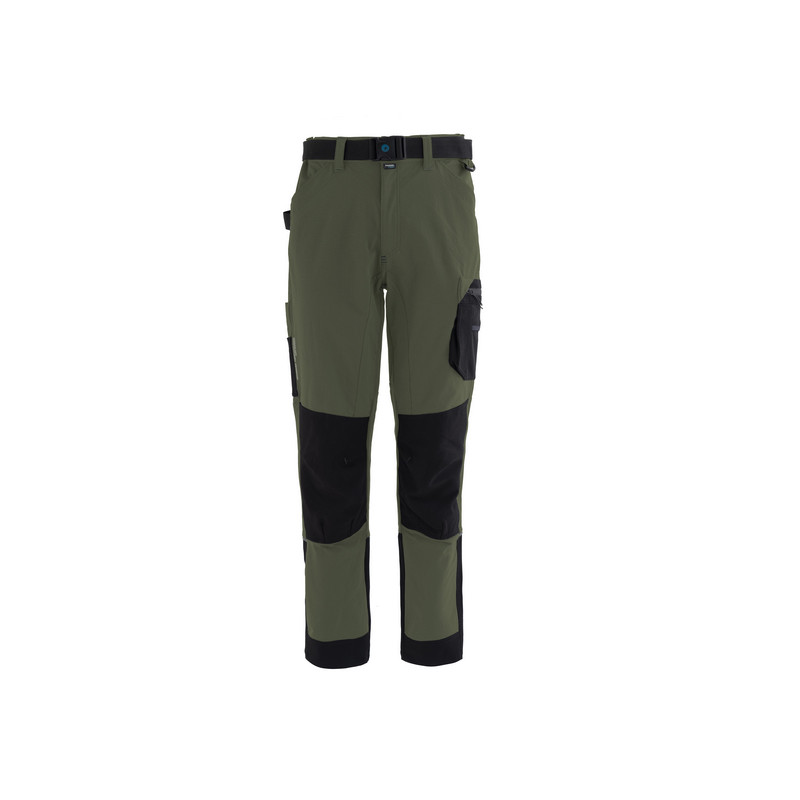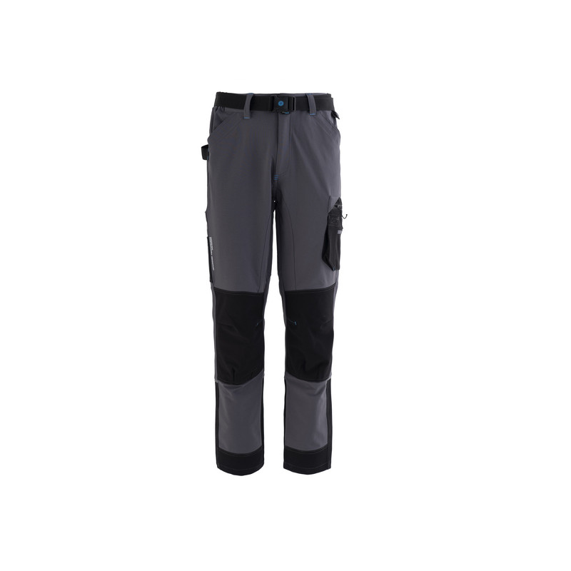 Pantalone da lavoro in tessuto stretch nelle quattro direzioni, ultraleggero e traspirante, elastici laterali in vita e passanti, inserto in rete di colore a contrasto nella zona renale. Chiusura alla patta con zip e bottone in metallo con finitura effetto rame. Pratica cintura estraibile in poliestere, regolabile con fibbia a chiusura automatica. Inserto in poliestere sul fianco destro ed anello di plastica inserito sul fianco sinistro utili per appendere accessori e strumenti. Due ampie tasche anteriori, tasca laterale porta metro applicata su gamba destra con ulteriore taschino in tessuto Ripstop, tascone laterale applicato sulla gamba sinistra chiuso con zip e con ulteriori due taschini, uno in tessuto Ripstop ed uno in mesh di poliestere. Due tasche posteriori, una a destra chiusa con aletta e velcro, una a sinistra chiusa con zip. Tessuto Ripstop sul fondo gamba con profilo rifrangente orizzontale inserito nella cucitura. Cavallo con doppio tessuto e tripla cucitura. Rinforzi di tessuto Ripstop di colore a contrasto sulle ginocchia. Travette a contrasto, pences alle ginocchia per maggior comfort.