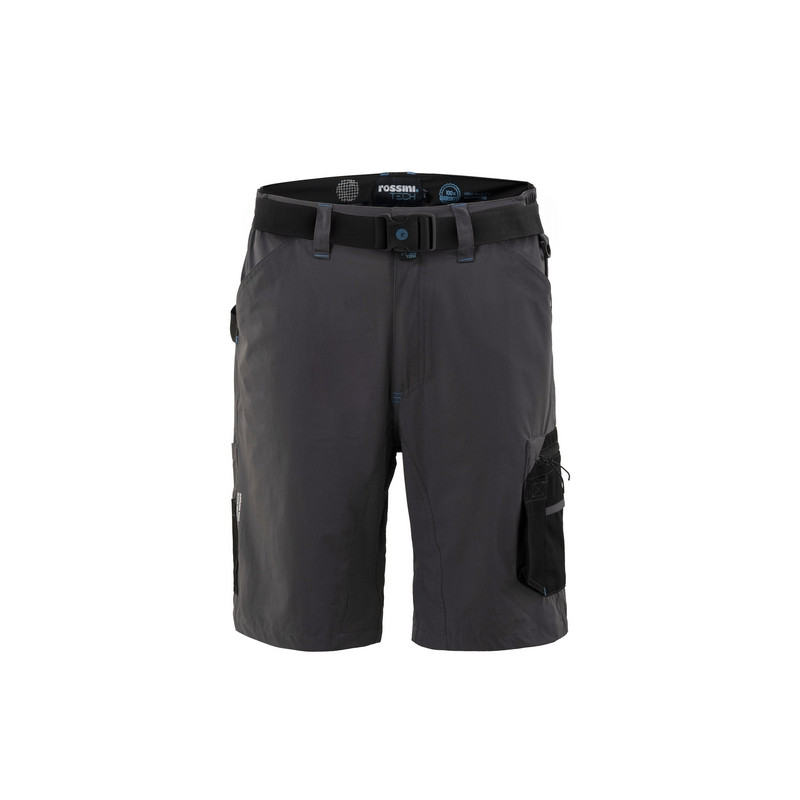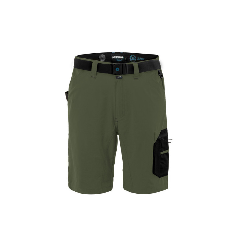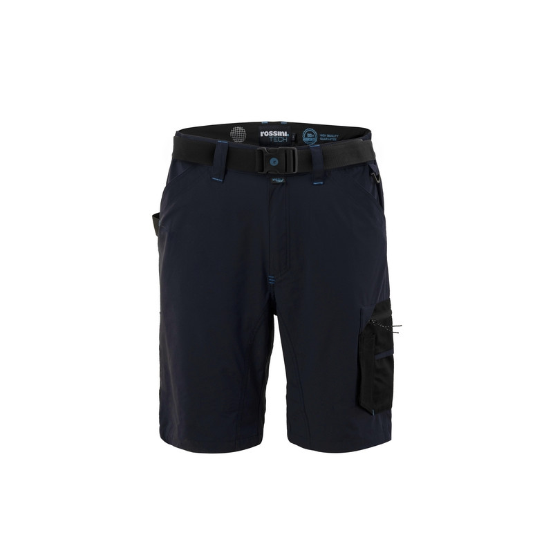 Bermuda da lavoro in tessuto stretch nelle quattro direzioni, ultraleggero e traspirante, elastici laterali in vita e passanti, inserto in rete di colore a contrasto nella zona renale. Chiusura alla patta con zip e bottone in metallo con finitura effetto rame. Pratica cintura estraibile in poliestere, regolabile con fibbia a chiusura automatica. Inserto in poliestere sul fianco destro ed anello di plastica inserito sul fianco sinistro utili per appendere accessori e strumenti. Due ampie tasche anteriori, tasca laterale porta metro applicata su gamba destra con ulteriore taschino in tessuto Ripstop, tascone laterale applicato sulla gamba sinistra chiuso con zip e con ulteriori due taschini, uno in tessuto Ripstop ed uno in mesh di poliestere. Due tasche posteriori, una a destra chiusa con aletta e velcro, una a sinistra chiusa con zip. Profilo rifrangente orizzontale inserito sul fondo gamba posteriore. Cavallo con doppio tessuto e tripla cucitura.