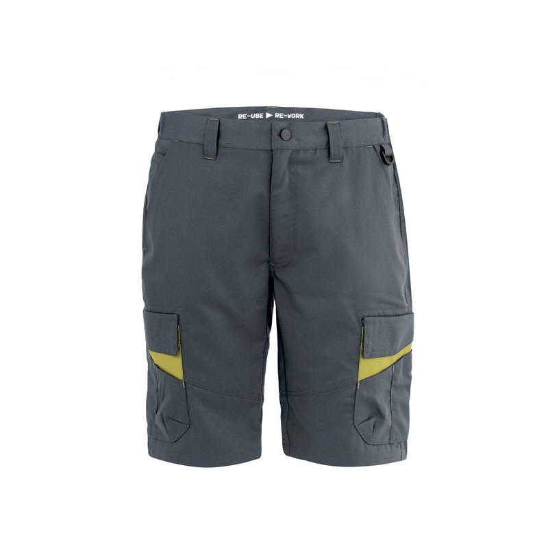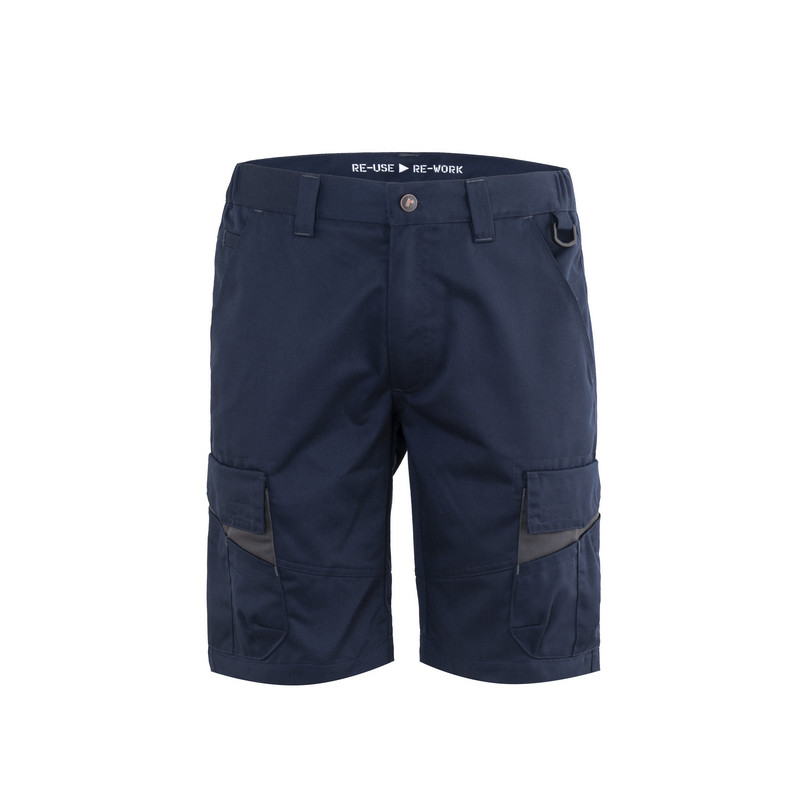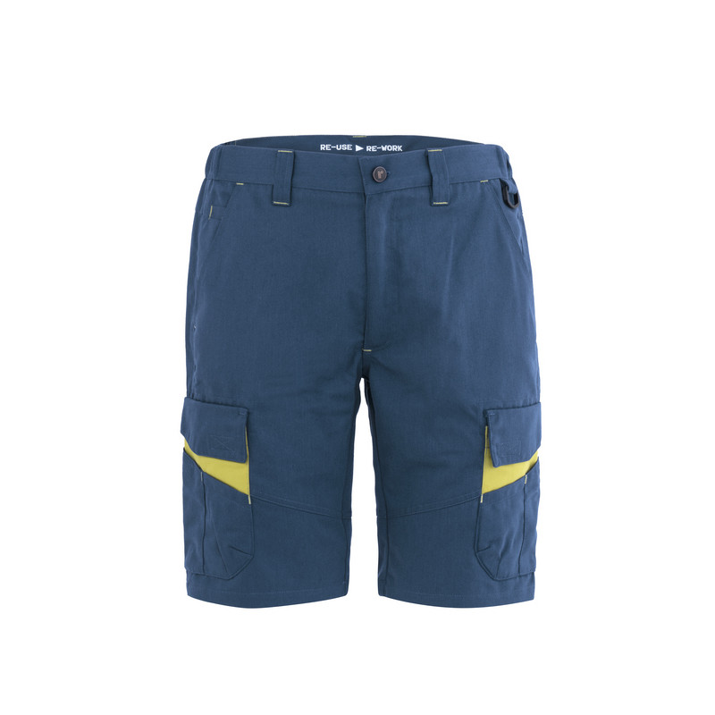 Bermuda da lavoro con elastico ai fianchi, chiusura alla patta con cerniera in plastica e bottone in metallo con finitura effetto rame, passanti in vita, fettuccia in cotone di colore a contrasto inserita all’interno della vita. Pratico anello di plastica inserito sul fianco sinistro per appendere accessori e strumenti. Due tasche anteriori con taglio classico e fodera con logo, un taschino a filetto inserito all’interno della tasca destra, capienti tasconi laterali multifunzione con inserto di colore a contrasto e chiusi con aletta e velcro, due tasche posteriori a filetto. Cuciture di rinforzo di colore a contrasto.