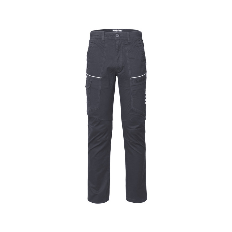 Pantalone da lavoro multitasca invernale da donna in cotone twill elasticizzato, con elastici laterali e passanti in vita, chiusura con zip e bottone. Due tasche anteriori applicate a taglio classico con inserto di rinforzo a rilievo e fodera logata, ulteriore tasca davanti nella parte inferiore e tasca laterale porta metro sulla gamba sinistra, tasca laterale chiusa con aletta e velcro sulla gamba destra, due tasche posteriori applicate. Dettagli di tessuto a spina di pesce sulle tasche davanti e vicino al porta metro, triple cuciture al cavallo, pences alle ginocchia per maggior comfort. Profili orizzontali nel taglio delle tasche anteriori e 4 bande su tasca porta metro in tessuto rifrangente.