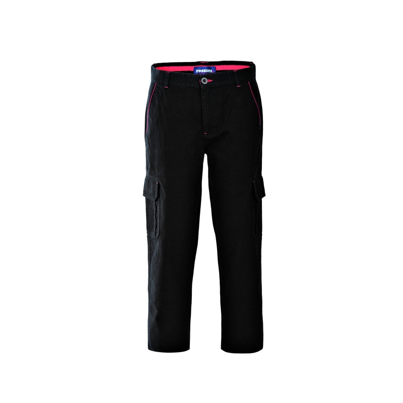 Pantalone da lavoro con elastico ai fianchi interno regolabile, chiusura alla patta con cerniera e bottone in cintura, travette varie di colore rosso. Due tasconi laterali con soffietto centrale chiusi con aletta e punti velcro, due tasche anteriori interne con cucitura di colore rosso, una tasca posteriore applicata a destra chiusa con aletta e punti velcro, una tasca posteriore applicata a sinistra chiusa con bottone tradizionale.