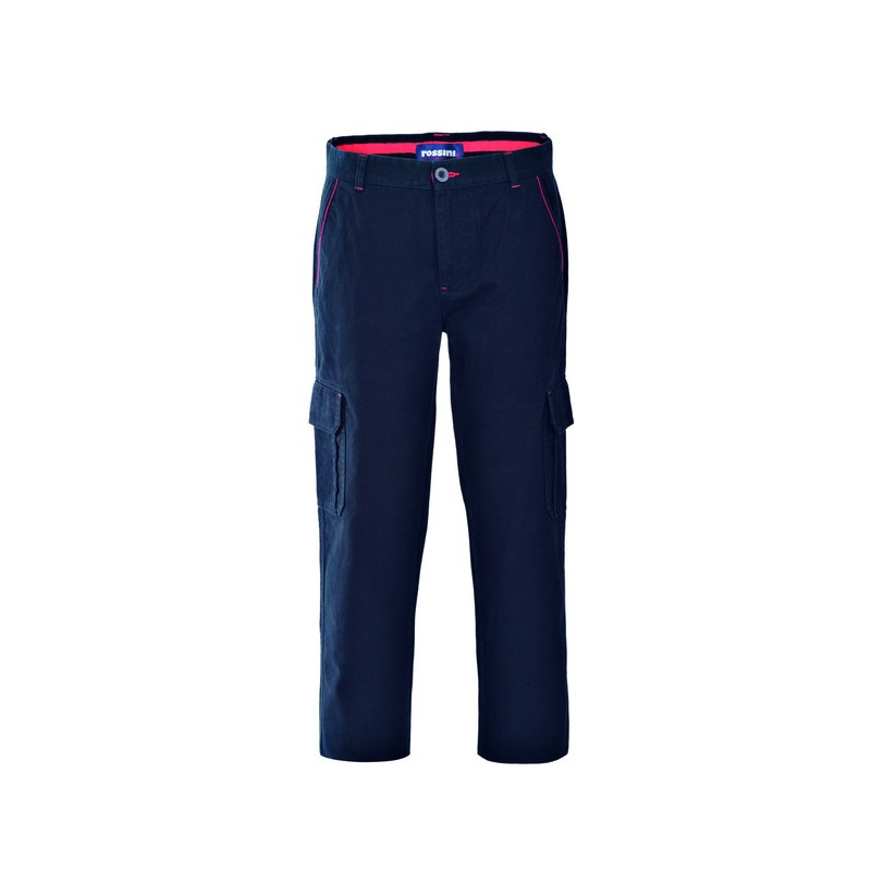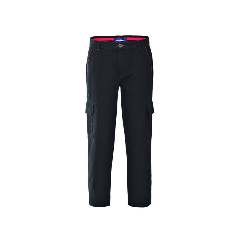 Pantalone da lavoro con elastico ai fianchi interno regolabile, chiusura alla patta con cerniera e bottone in cintura, travette varie di colore rosso. Due tasconi laterali con soffietto centrale chiusi con aletta e punti velcro, due tasche anteriori interne con cucitura di colore rosso, una tasca posteriore applicata a destra chiusa con aletta e punti velcro, una tasca posteriore applicata a sinistra chiusa con bottone tradizionale.