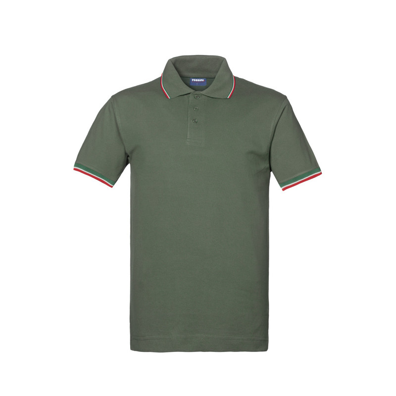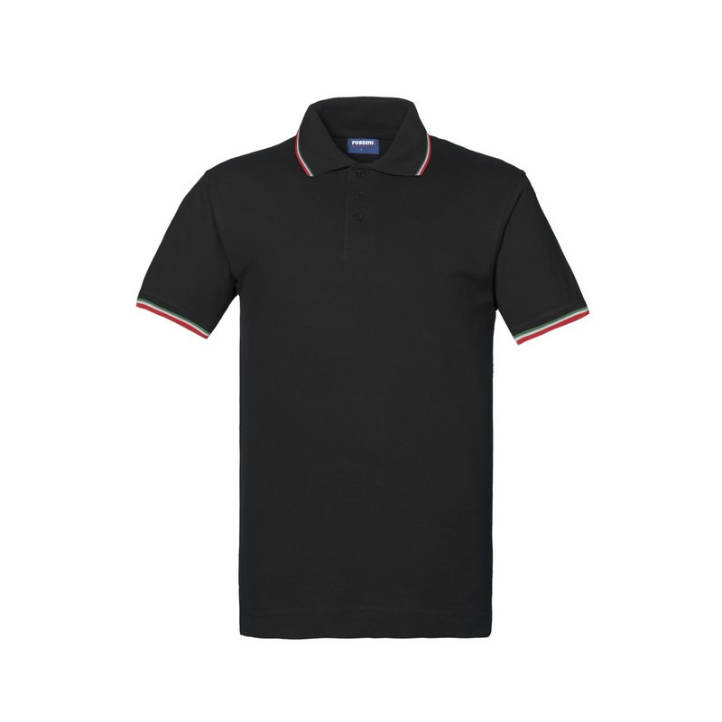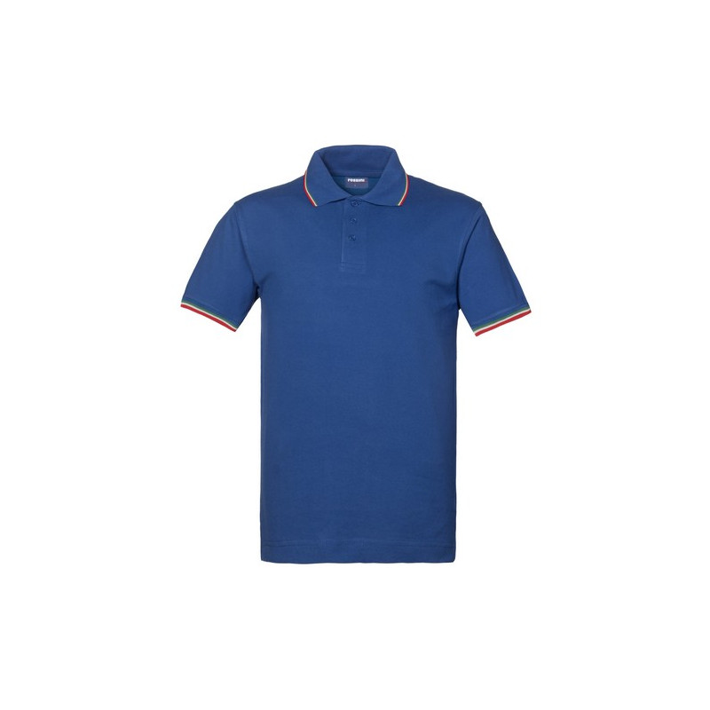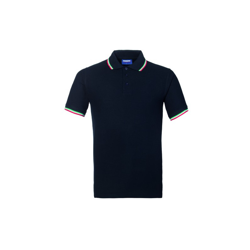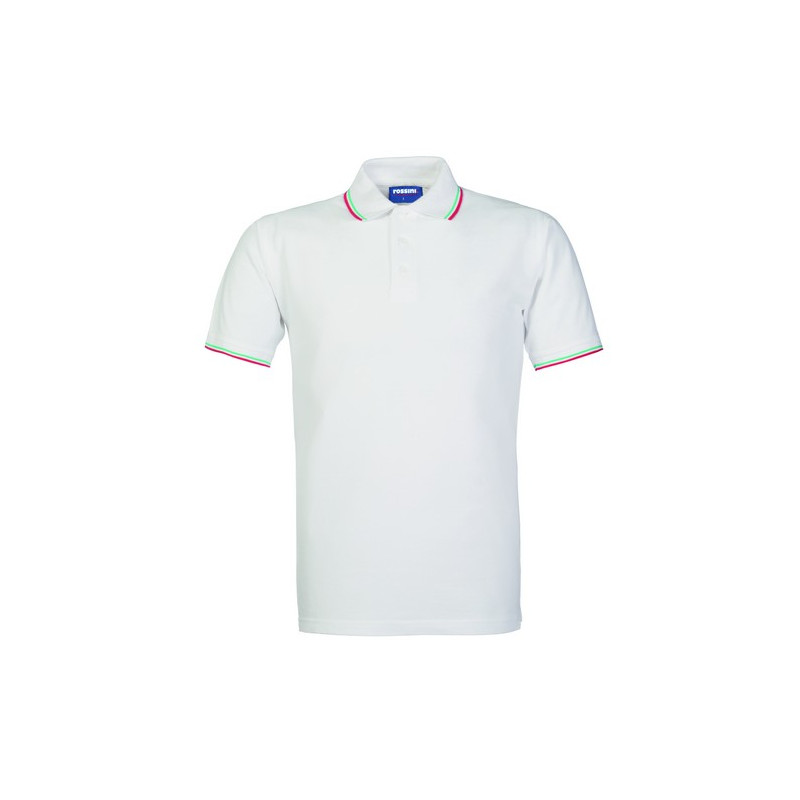 Polo mezza manica con fascia parasudore nella parte posteriore del collo, profili tricolore al collo, chiusa con tre bottoni, giromanica a costina con profili tricolore, spacchetti laterali al fondo con inserto tricolore.