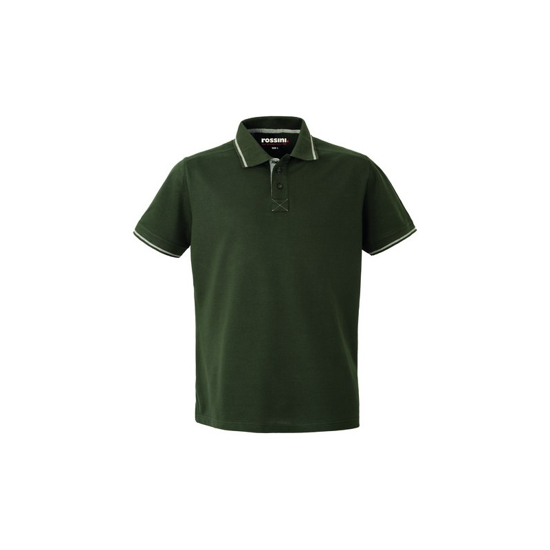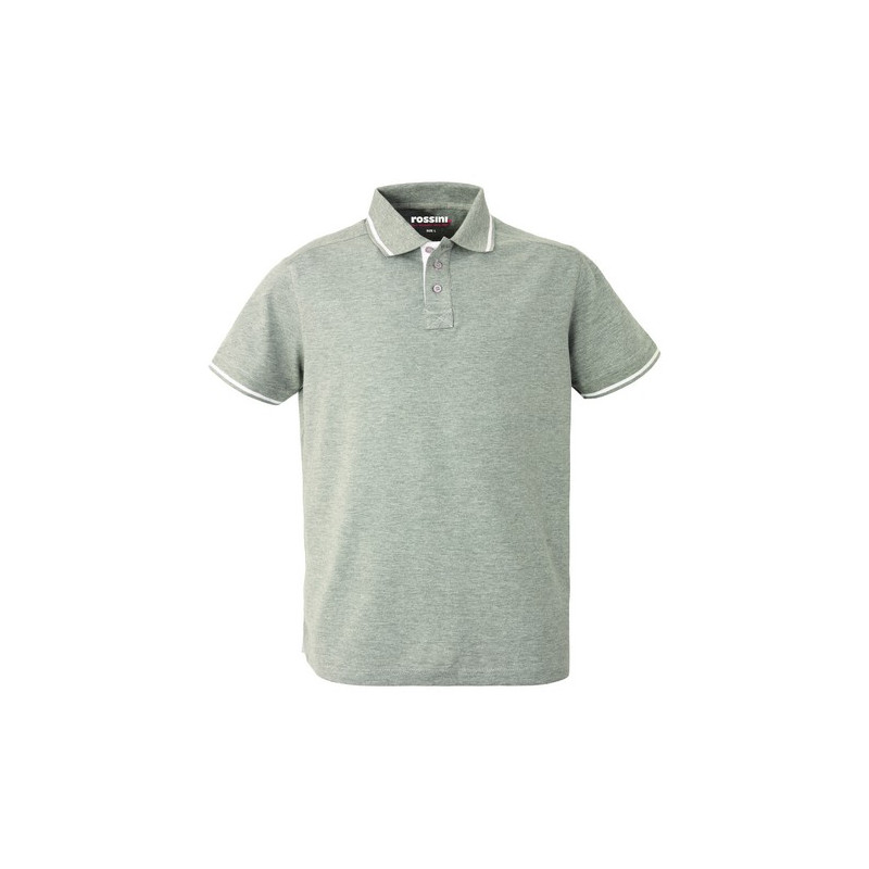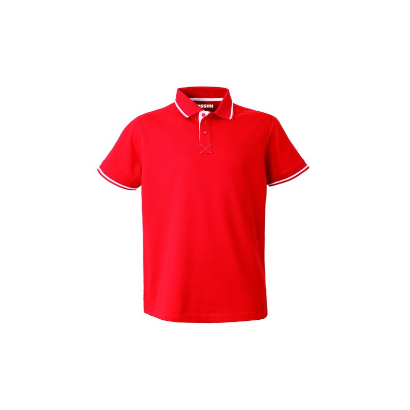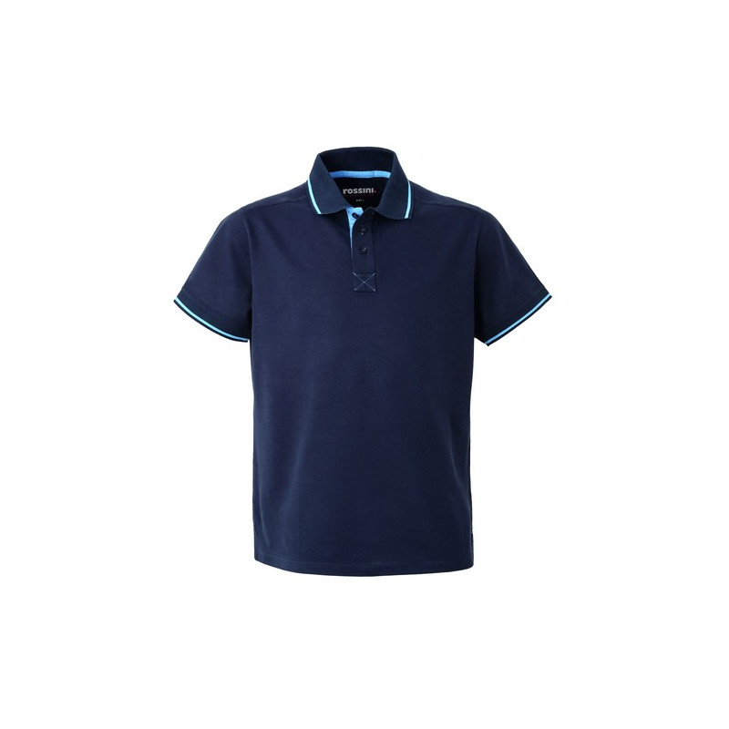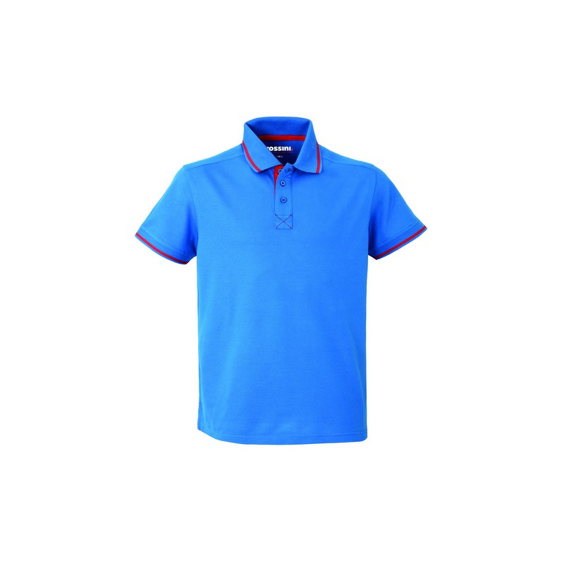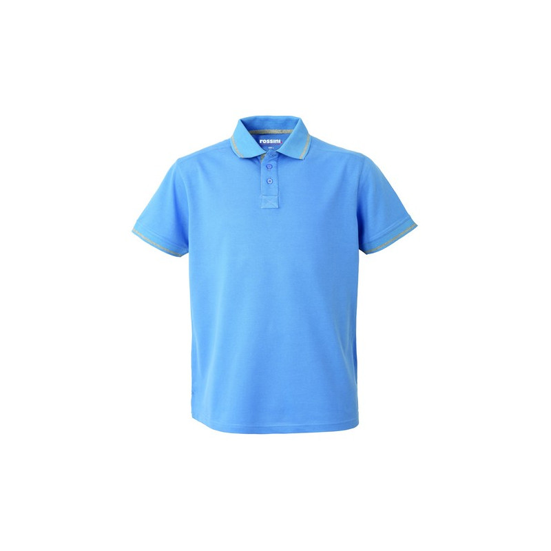 Polo mezza manica con fascia parasudore e bottoniera di colore a contrasto, sottocollo di colore a contrasto collo chiuso con tre bottoni, giromanica a costina di colore a contrasto, spacchetti laterali al fondo di colore a contrasto.