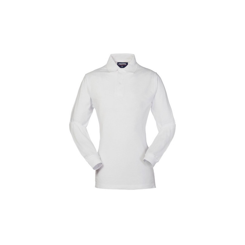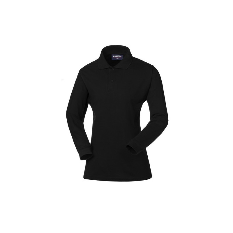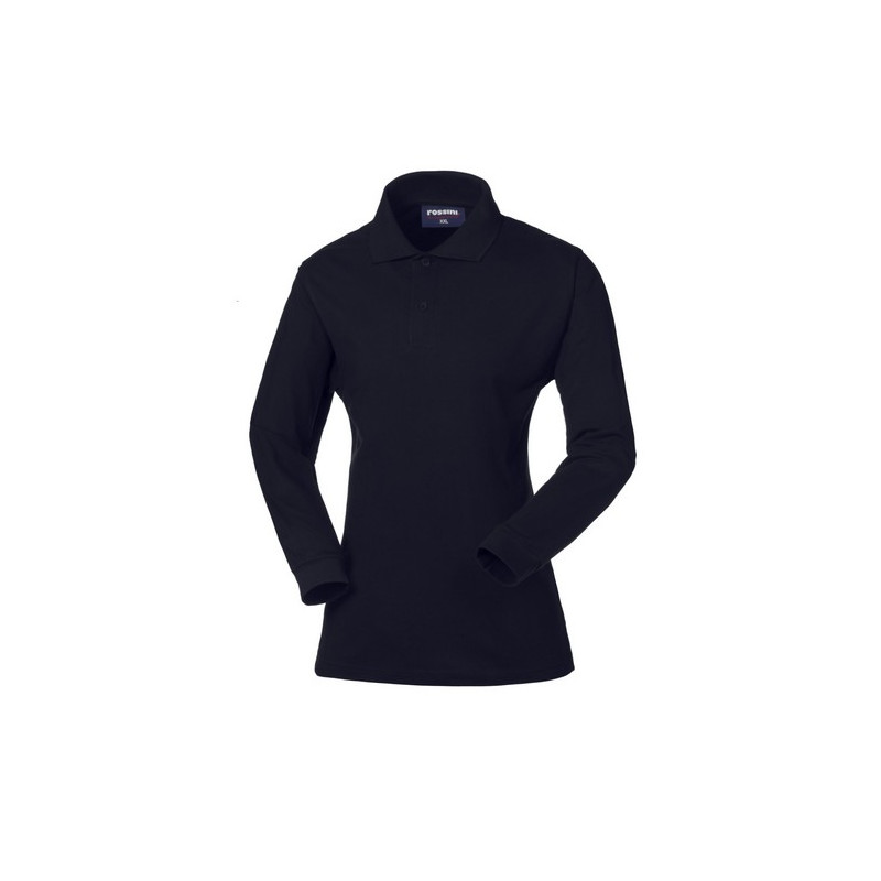 Polo manica lunga da donna con polsino in maglia, rinforzo sulla parte posteriore del collo con fascia parasudore interna, collo chiuso con due bottoni, spacchetti al fondo.
