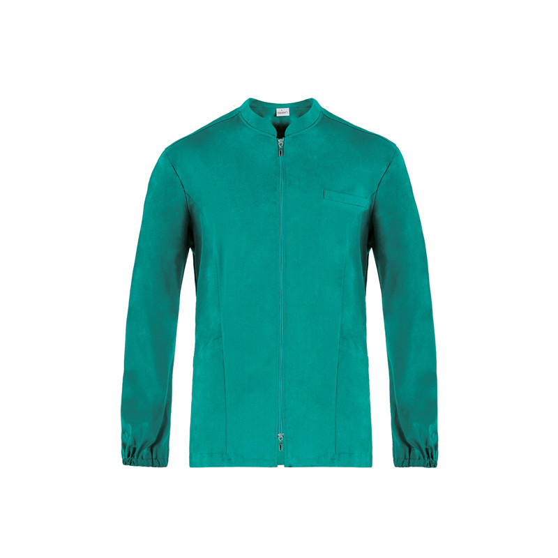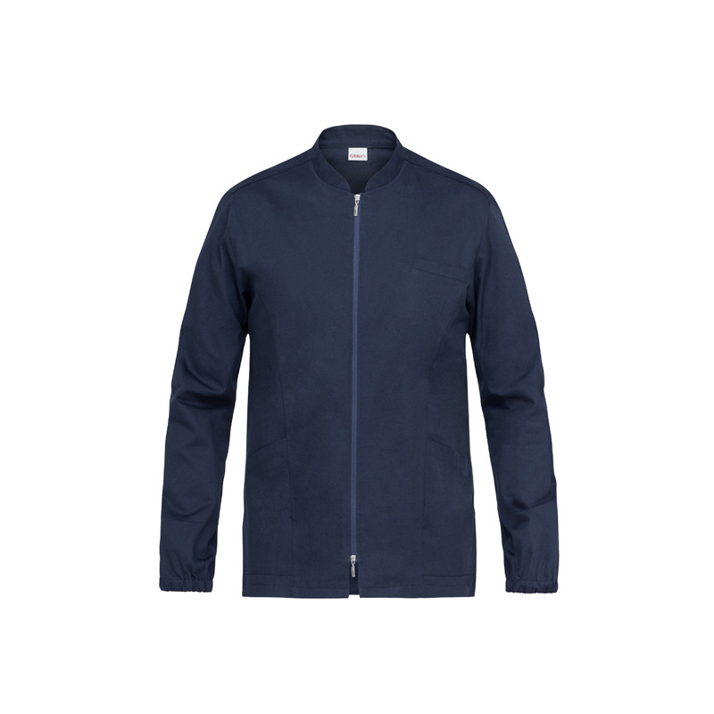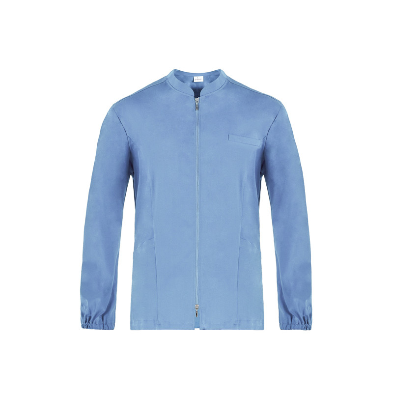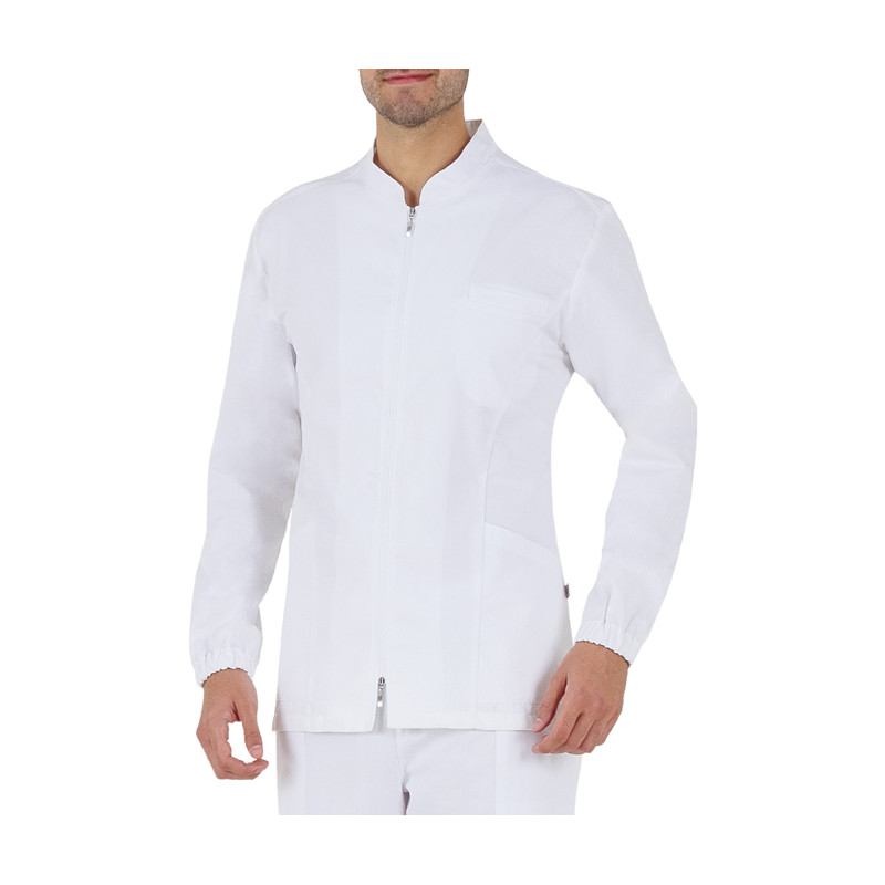 20P03K194 La casacca Gabriele con vestibilità Slim Fit, collo alla coreana, apertura centrale con zip rovesciata, taschino sul petto, tasche davanti ed elastico al polso. È realizzata in gabardine 100% cotone, un tessuto resistente sia alle alte temperature che ai lavaggi con cloro, pur mantenendo una mano morbida.
