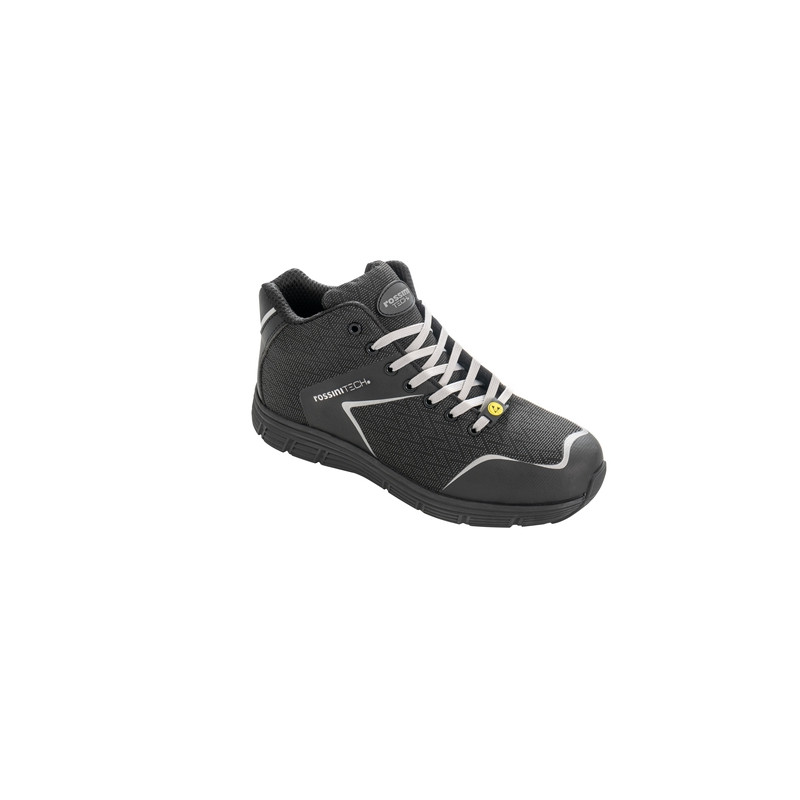 Calzatura alta dal peso leggero, solo 440 grammi, in esclusivo tessuto alta tenacità idrorepellente di colore nero con applicazioni rifrangenti di colore grigio. Fodera interna R-DRY antiodore di colore nero, linguetta imbottita, puntale in fibra di vetro ultralight, lamina antiperforazione non metallica ultralight, soletta anatomica, traforata, con gel antishock sul tallone che assorbe gli urti, estraibile, traspirante ed antistatica. Suola antiscivolo in Eva Ultralight e battistrada in gomma. CALZATURA METAL FREE Calzata 11 Mondo Point
