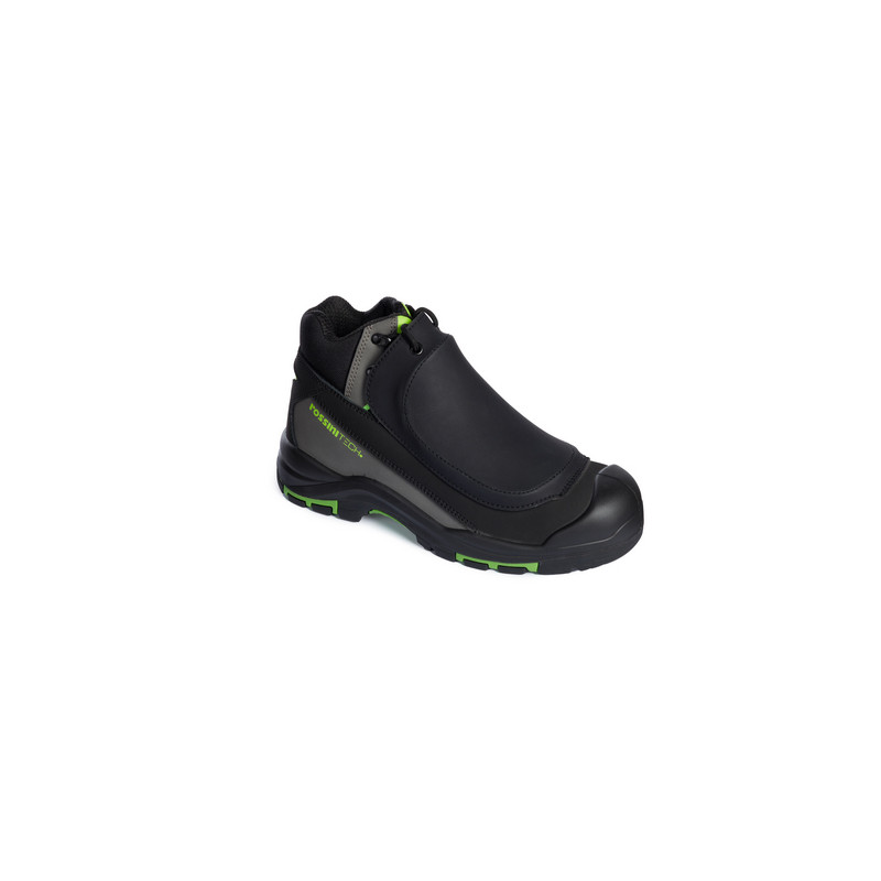 Calzatura alta con sistema rigido di protezione metatarsale e tomaia in pelle con trattamento effetto nabuk, con dettagli verdi in contrasto, linguetta imbottita in canvas mesh, puntale in fibra di vetro, lamina non metallica, fodera interna in tessuto traspirante. Soletta anatomica, traforata, con gel antishock sul tallone che assorbe gli urti, estraibile, traspirante ed antistatica. Suola antiscivolo in poliuretano bidensità.