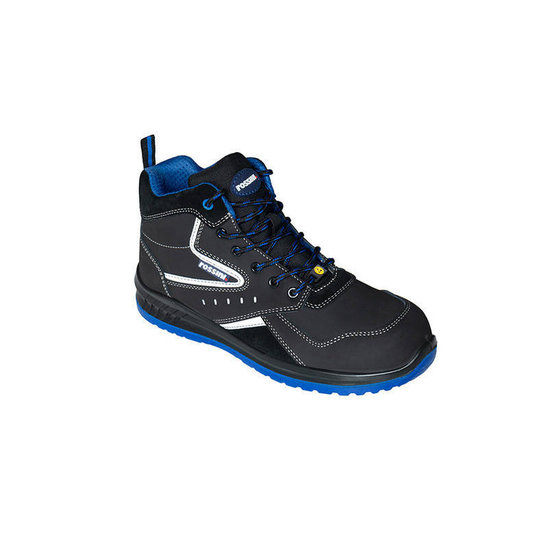 Calzatura alta in pelle effetto nabuk con inserti in pelle scamosciata e applicazioni reflex che migliorano la visibilità. Solo 500 grammi. Fodera interna in mesh antiodore di colore blu, linguetta imbottita, puntale in fibra di vetro, lamina non metallica, soletta anatomica, traforata, con gel antishock sul tallone che assorbe gli urti, estraibile, traspirante ed antistatica. Suola antiscivolo in poliuretano bidensità.