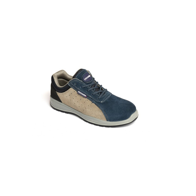 Calzatura bassa in pelle scamosciata forata di colore blu e grigio, fodera interna di colore grigio, linguetta imbottita, puntale in composito lamina non metallica, soletta estraibile traspirante antistatica. Suola in poliuretano bidensità. SCALZATURA METAL FREE