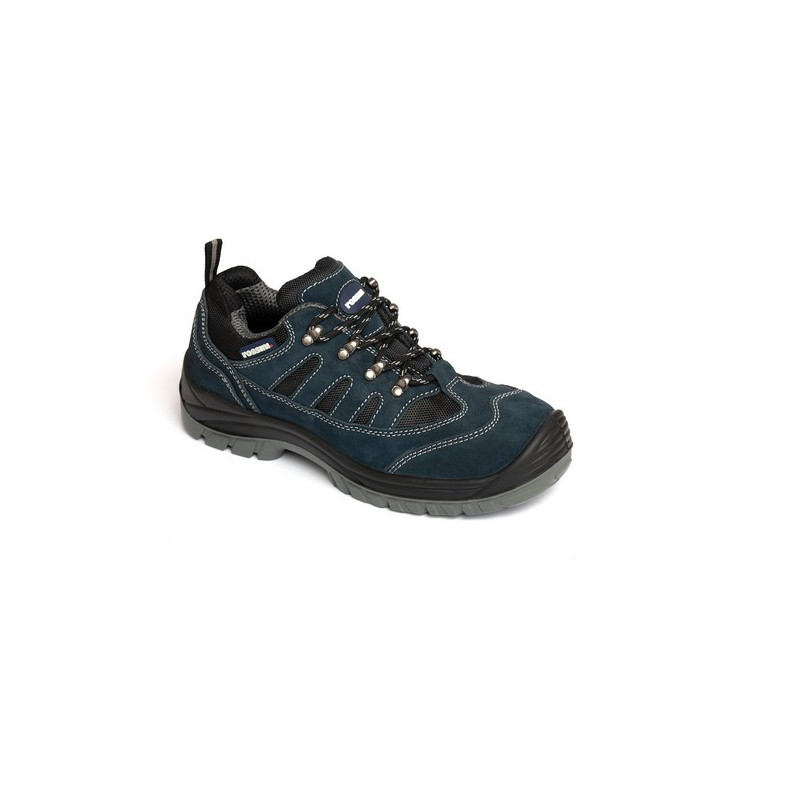 Calzatura bassa in pelle scamosciata di colore blu con inserti in nylon e cuciture di colore a contrasto, fodera interna di colore grigio e nero, linguetta imbottita, puntale in composito, lamina non metallica, soletta anatomica, traforata, con tallone antishock, estraibile traspirante e antistatica. Suola in poliuretano bidensità.