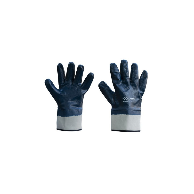 Guanto interamente riverstito in nitrile, fodera interna in cotone jersey, manichetta di sicurezza.