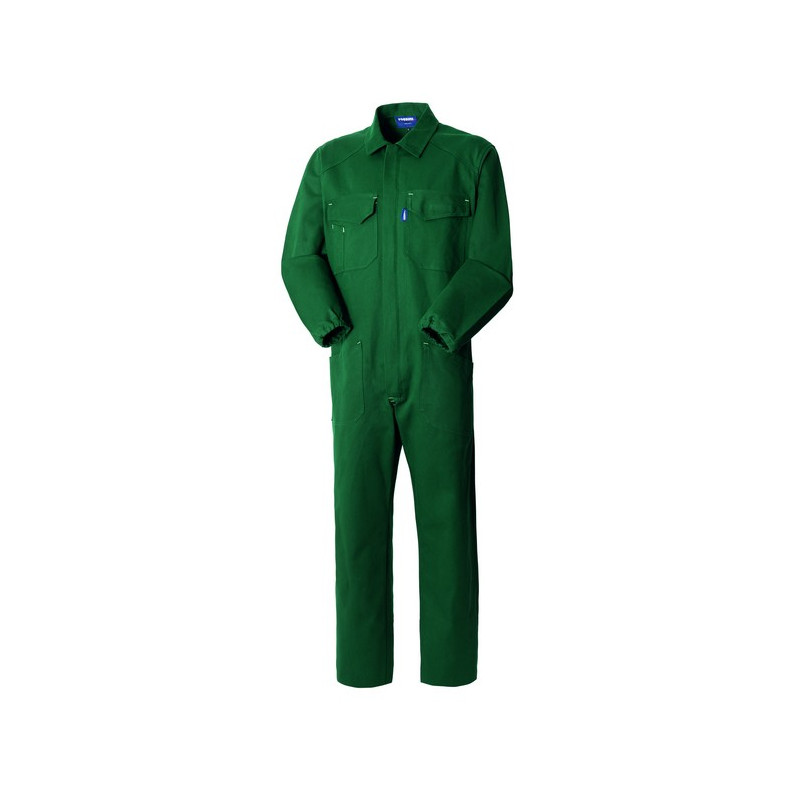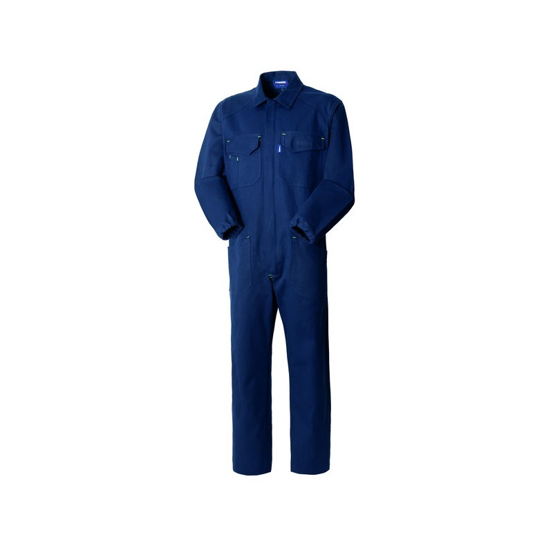 Tuta da lavoro con chiusura centrale con zip a doppio cursore coperta da patella, elastico in vita posteriore, schiena intera. Due taschini al petto chiusi con aletta e velcro di cui uno con porta penne, due tasche inferiori applicate, una tasca portametro applicata su gamba destra, una tasca posteriore a destra chiusa con bottone, elastico ai polsi, travette di colore a contrasto.