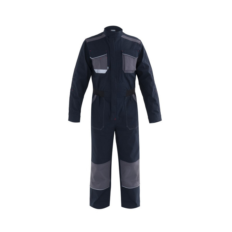 Tuta da lavoro multistagione in canvas stretch con collo alla coreana chiuso con velcro,chiusura centrale con zip a doppio cursore coperta da patella. Una tasca applicata al petto destro con inserto rifrangente, con portapenne e chiusa con aletta e velcro, una tasca applicata al petto sinistro con patella removibile per facilitare il ricamo chiusa con aletta e velcro, cuciture di rinforzo ai gomiti, polsi regolabili con velcro, elastico in vita, due tasche inferiori applicate, una tasca portametro applicata su gamba destra, una tasca posteriore a destra chiusa con aletta di colore a contrasto e velcro. Rinforzi di tessuto a contrasto sulle ginocchia e travette a contrasto, profilo rifrangente inserito nelle alette delle tasche e sotto le ginocchia.