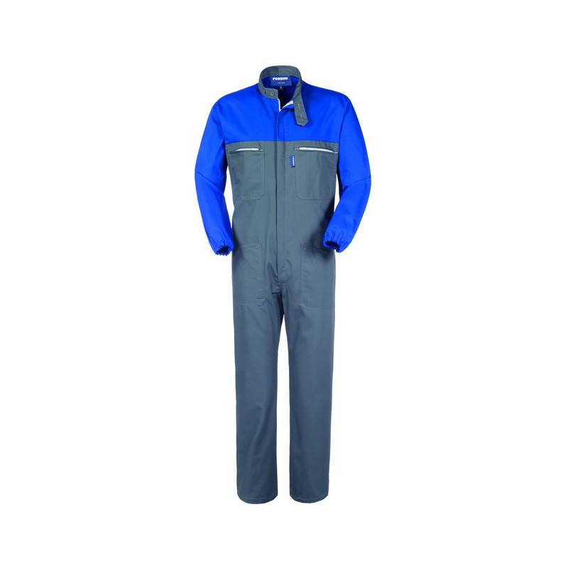 Tuta da lavoro con chiusura con cerniera centrale coperta, carré anteriore e posteriore e maniche di colore a contrasto, collo alla coreana chiuso con due bottoni. Due tasche anteriori applicate, due taschini applicati al petto chiusi con cerniera, elastico in vita posteriore, elastico ai polsi.
