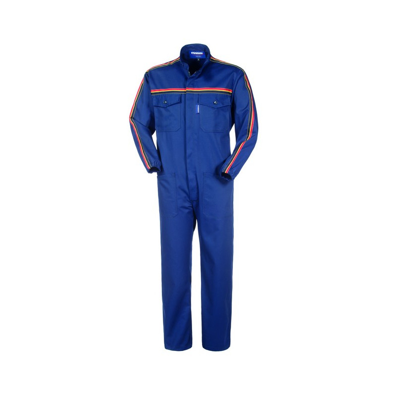 Visualizza ingrandito Tuta da lavoro con chiusura centrale con zip a doppio cursore coperta da patella, striscia tricolore su spalle, maniche e petto, collo alla coreana chiuso con un bottone. Due tasche anteriori applicate, due taschini applicati al petto chiusi con aletta e bottone, elastico in vita posteriore, elastico ai polsi.